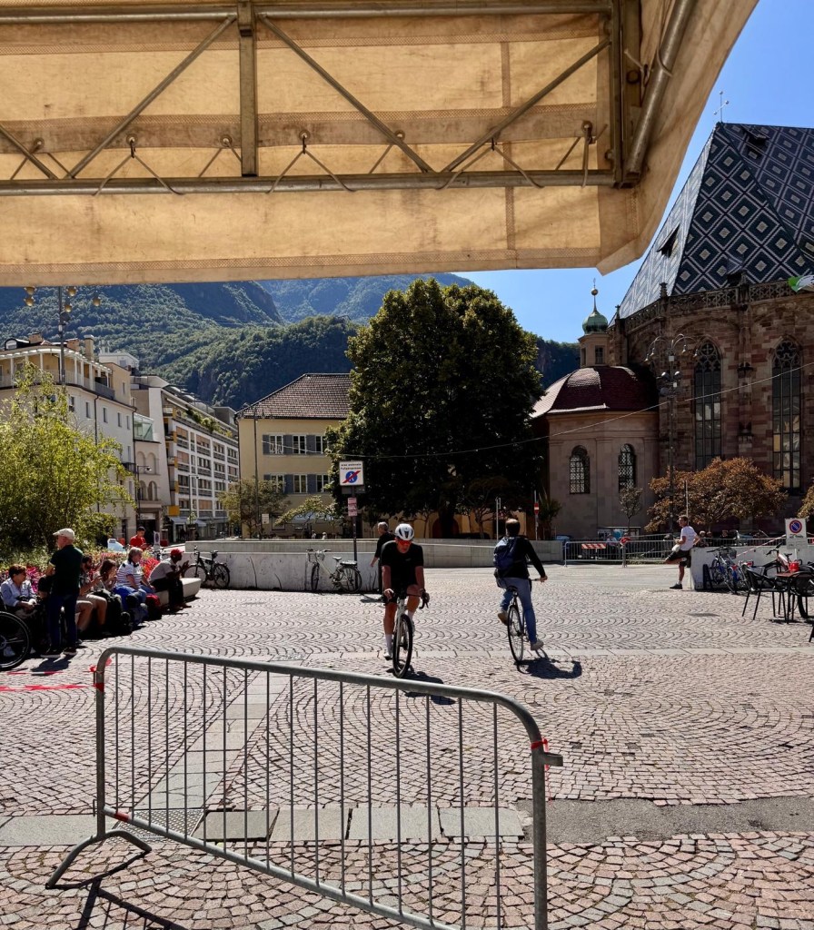 Het niet drie cijfers halen bij mijn fietsrondes begon te knagen. De zin bij ons twee om naar Bolzano te gaan net zo. Ook in Italië blikt één plus één twee te zijn, zelf als dat uno più uno fa duo is. We gingen naar Bolzano. Ik op de fiets en E met de auto. Afspraak op het Piazza Walther. Via de nieuwe tunnel de parkeergarage in.