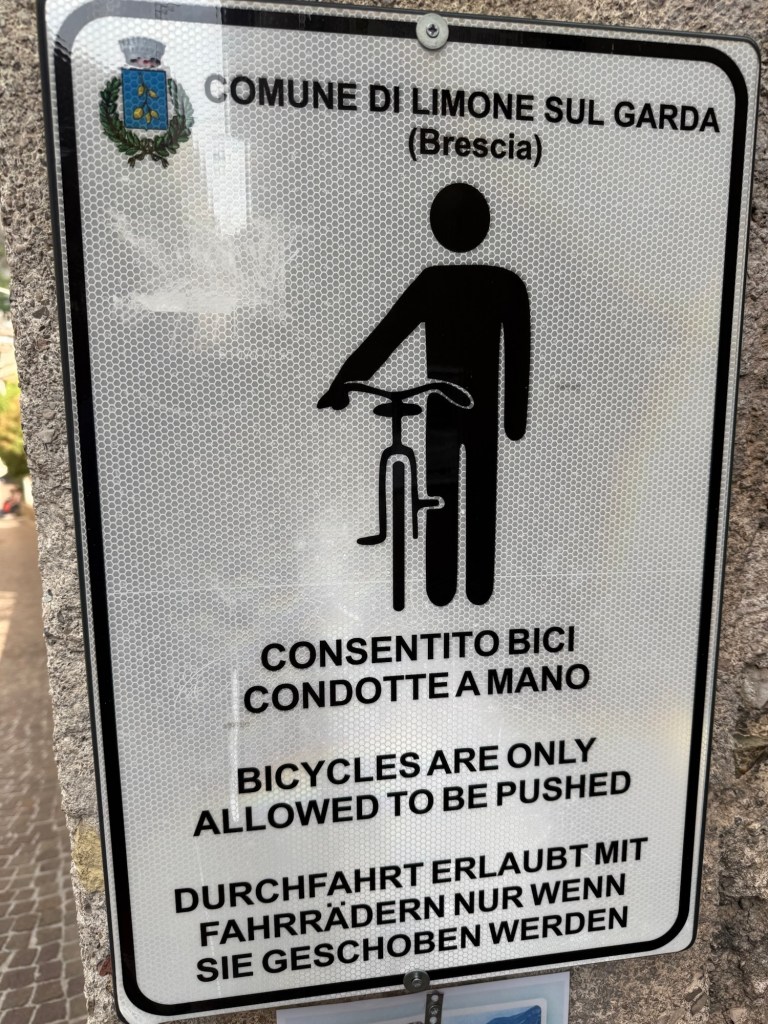 Ik ging iets na 8 uur op pad. Het fietspad richting Torbole was nog redelijk leeg en lag nog in de schaduw. De rest van de dag zou ik nog meer dan genoeg zon te zien krijgen en ik ben niet zo Italiaans dat ik voor de eerste kilometers een Jack aantrek. Want inderdaad de eerste winterkleding ben ik al weer tegen gekomen.