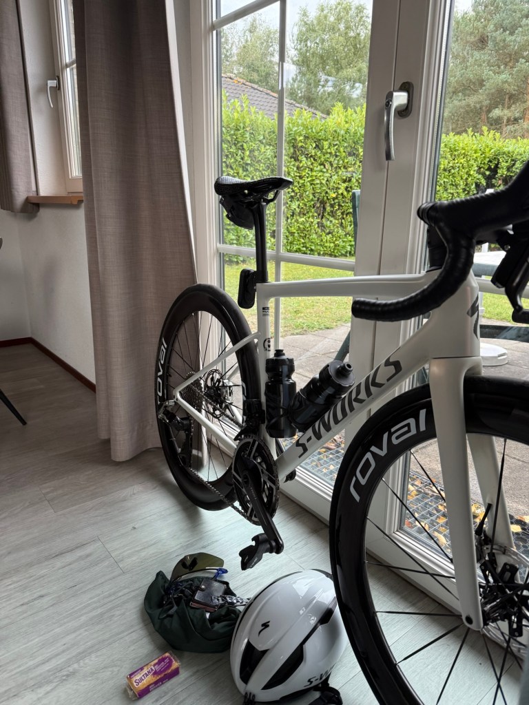 Thuis word ik met open armen ontvangen. Gelukkig maar. Want ik was alleen nog maar dorstig en hongerig en tot veel meer in staat dan het WK gravel kijken. Ook met een krom stuur, dus moest ik wel kijken.