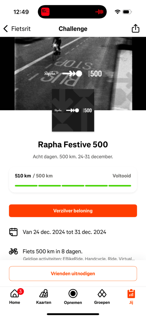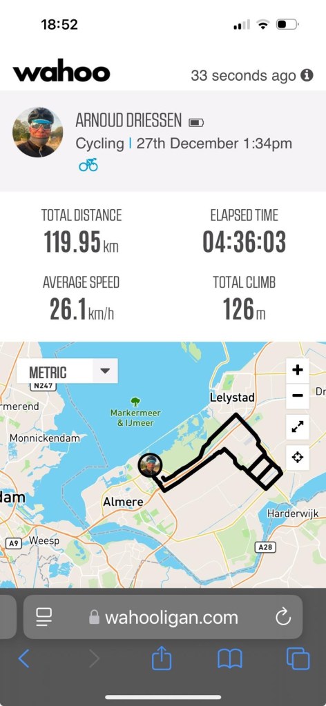 De druk is van de ketel. Bij mijn opmerking op Strava dat het lekker is als het niet meer moet, kreeg ik terecht de opmerking dat toch niets moet. Deed me denken aan de uitroep van Wout van Aert: “Ik moest just niks”. Het is natuurlijk hobby, maar met af en toe een doel is er toch de persoonlijke druk. Zeker rondom de Festive 500. Willen halen.