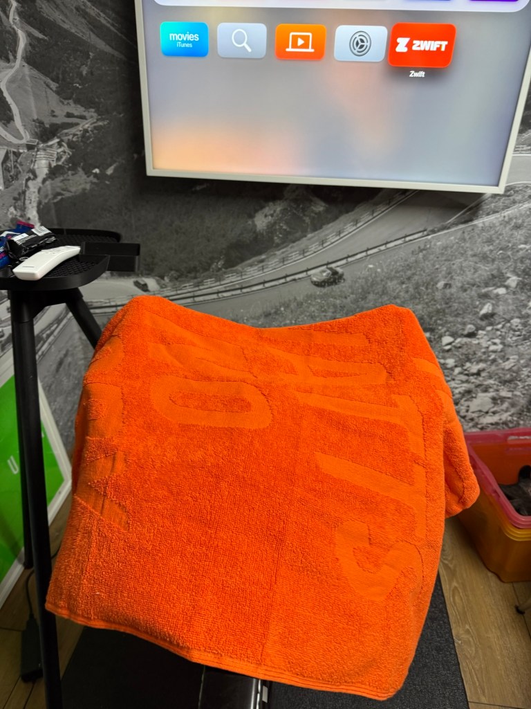 Ik was extra verwend met het ideale handdoekje voor op de Kickr. La Machine heeft het handdoekje gemaakt dat precies breed, lang en zacht genoeg is en dan ook nog eens in Zwift en Strava oranje. No Watts, No Glory.