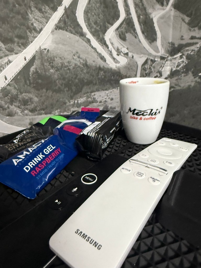 De gedachten dwalen daarbij uiteraard weg naar Italiaanse wegen. Voor de geïnteresseerden, die eigenlijk zo nodige sportvoeding die ik op het zo handige tafeltje van Tons, niet gesponsord maar een top product, heb liggen blijven er liggen. Zo goed als mijn voedingsstrategie vaak is als ik buiten fiets, zo slecht is hij binnen. Okay als ik het bij een uur laat, maar bij een goede drie, hoort wel wat meer dan het beetje dat er in mijn bidon zit.