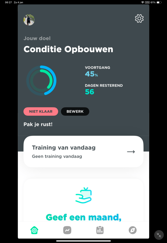 Van niets naar bijna 75 minuten. Helemaal tevreden. Er ook weer van overtuigd dat ik ook echt aan het einde van een dag nog kan fietsen en er niet verplicht alleen de dag maar mee kan en mag beginnen.
