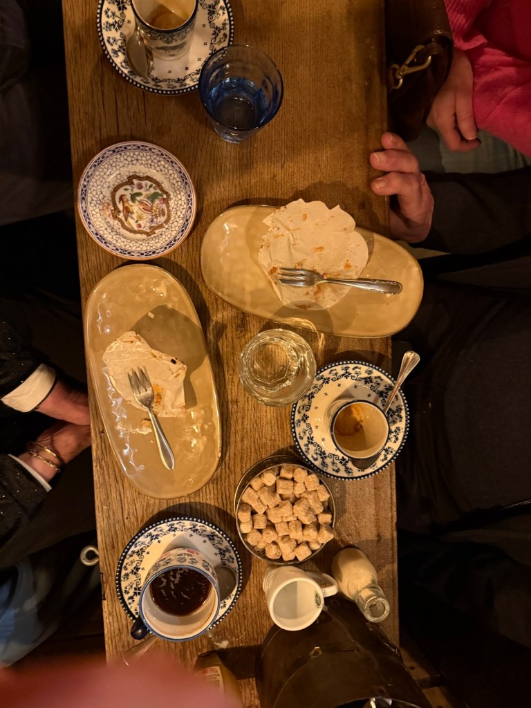 Doel van de dag is om vandaag over de helft te komen. Ik slaag. Nog beter geslaagd is de brunch. Eten van de ene naar de andere lekkernij. De opgebouwde tekorten worden allemaal weer ruimschoots aangevuld.