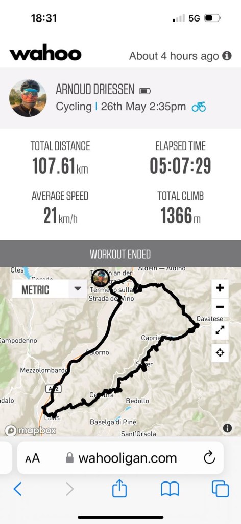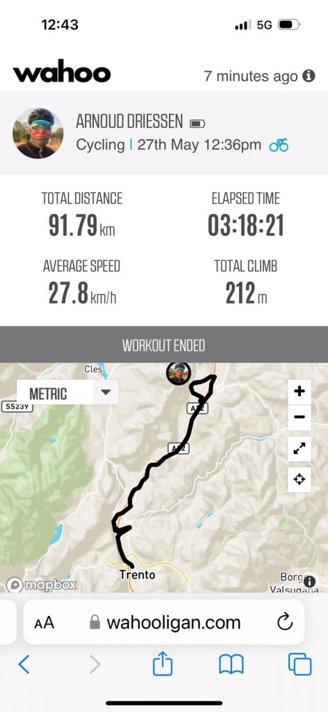 In een flow en in een trance. Lastig stukje het binnenland in en weer uit tot aan Trento. Precies daar waar ik E wil berichten kom ik 4 renners tegen die in de andere richting rijden. Ik besluit om te keren en meteen aan te sluiten. Iets van gezelschap is fijn.