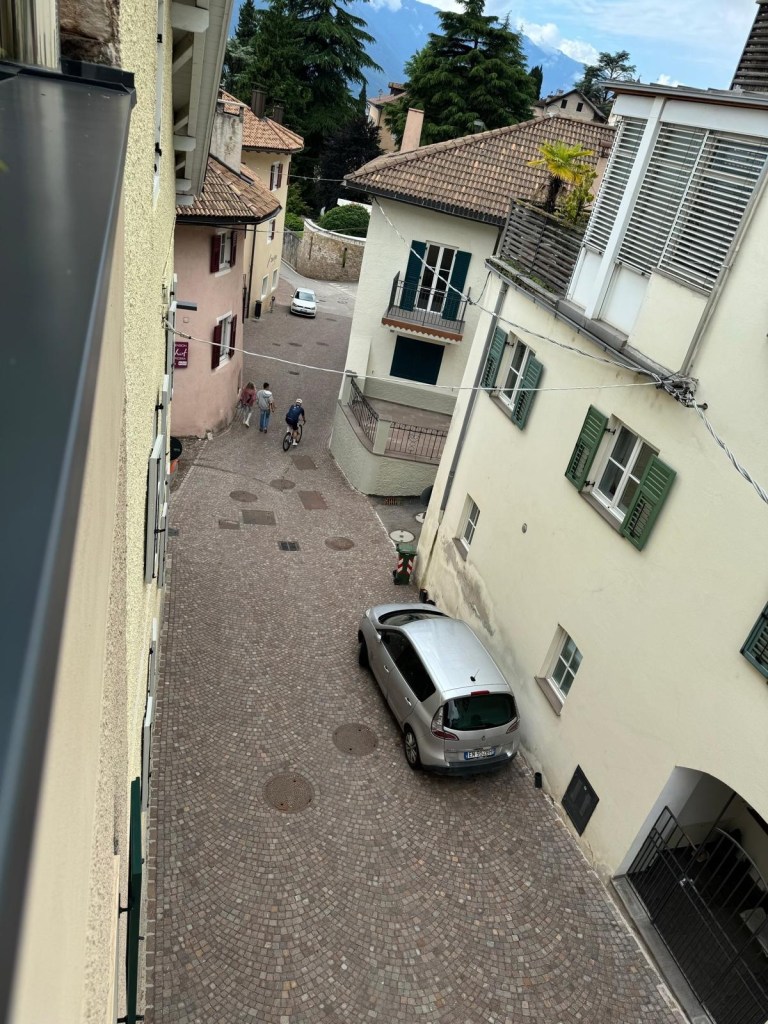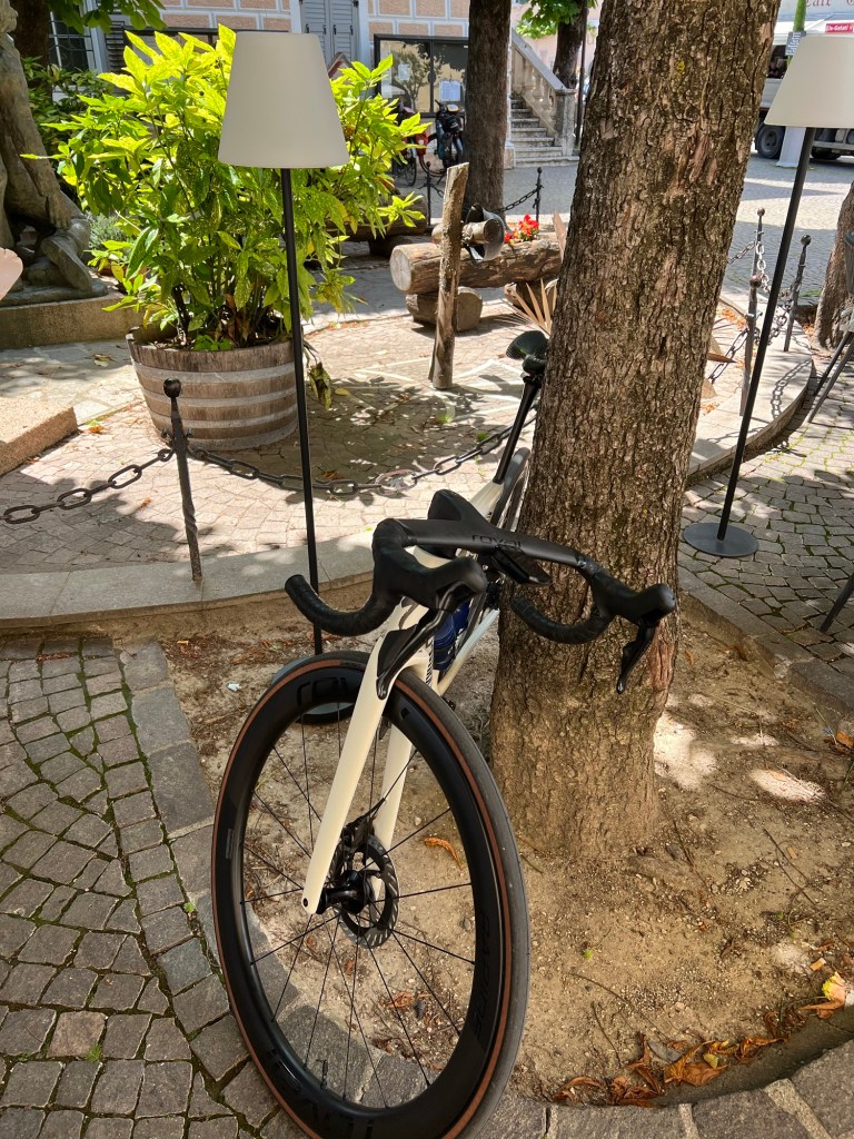 Bij het ontbijt zeg ik E het rustig aan te doen. Tour touristic. Over het fietspad naar Meran en als het er in zit even kijken bij de fietsenwinkel Flarer. De toonzaal van de mooiste Italiaanse merken: Pinarello, Colnago en Willier. Alleen de topmodellen in de etalage. De catwalk van de Italiaanse frames. Ook al rijd ik het niet er naar kijken doe ik graag. De fietsen van Pogacar, G of Arendsman en Cavendish staan daar te blinken in de etalage.