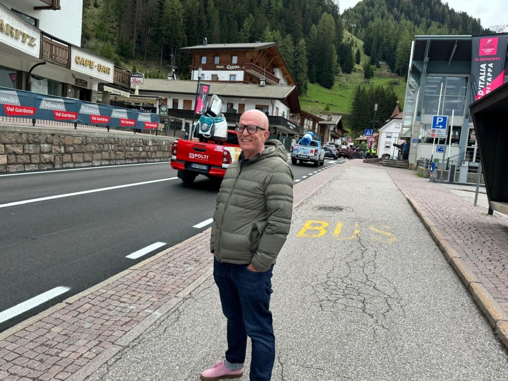 De man in roze. Even ontspannen hier als aan het einde van de etappe.
