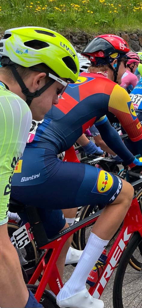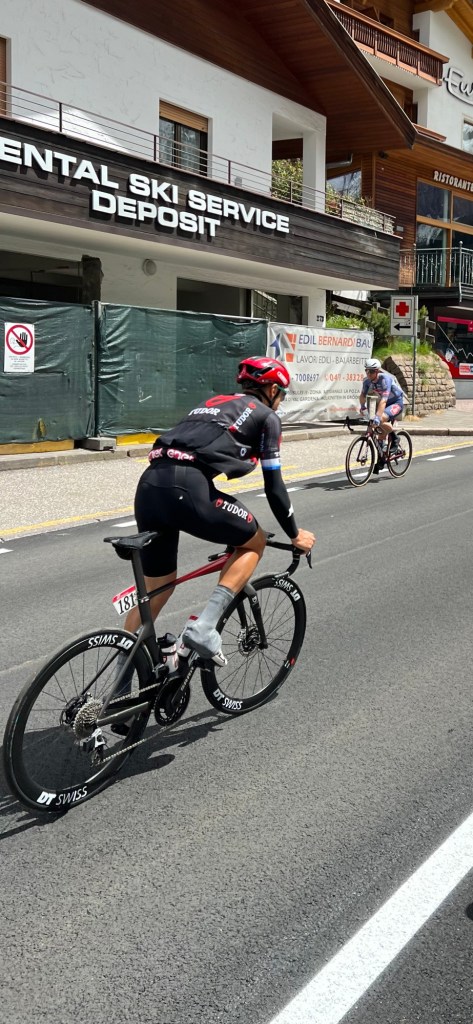 Krasse knarren zijn het. Uit mijn thuis fietsen weet ik dat leeftijd er niet veel toe doet. Het zijn talent en benen die in combinatie zorgen voor het resultaat. Ik zie Dolomieten op het overjasje staan en weet dat het Dolomietenmarathon rijders zijn. Als ze daar over ongeveer een maand weer zullen rijden zal de vorm stijgend zijn.