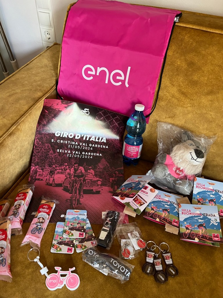 Een goede start van een Giro etappe heeft een goed sponsor dorp. Een goed sponsor dorp heeft vrijgevige vrolijke deelnemers. Ze zorgen voor een hebberig gevoel van prullaria. Prullaria voor in het eigen wielermuseum.