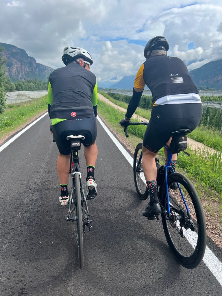 Op het fietspad richting Meran komen mijn nieuwe beste vrienden me weer achterop. Ze geven me een lachende vriendelijke opmerking. Ik sluit weer aan en we denderen door. Zie mijn wattage meter soms stevige getallen vertonen terwijl ik in het wiel zit. We rijden stevig door.