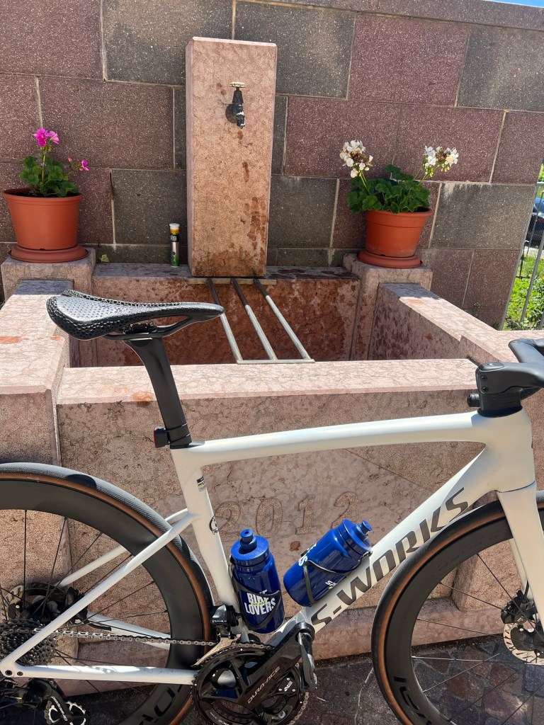 Ik fiets door. Kom er bij het drinken achter dat ik de dop van de bidon niet strak genoeg heb dichtgedraaid en neem twee keer een halve douche. Zonde als je maar met één bidon rijdt.