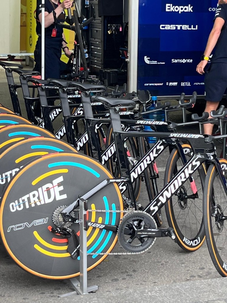 De oplettende kijker ziet nog iets heel bijzonders, de OSPW systeem aan de achterderailleur. De aerodynamische versie van Ceramicspeed. Verder ook dat ze met pedalen rijden van Garmin als Powermeter. Zie je in het mannen peloton niet zo snel.