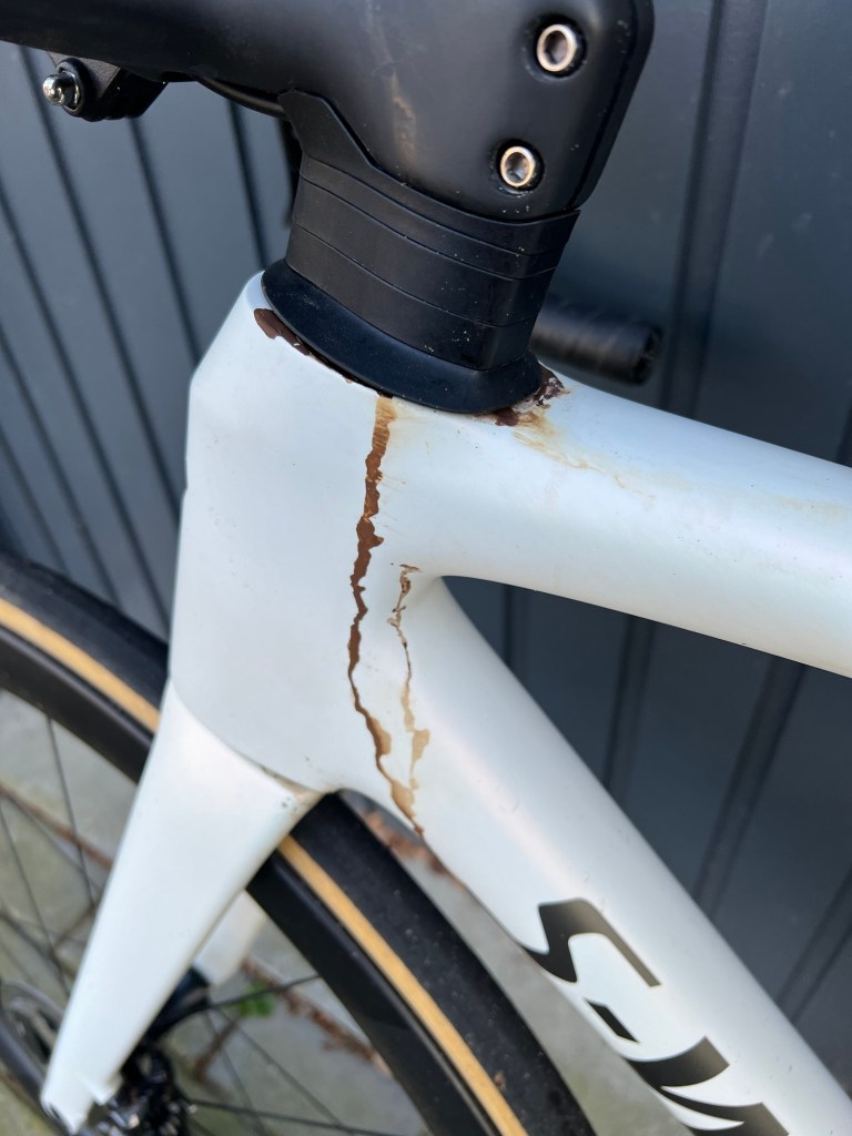 Het was ook nodig, want de headset lagers hadden een probleem. Niet zomaar een probleem, maar een echt probleem. De lagers liepen niet goed meer en er liep tijdens de regenbuien van de Ronde van Noord Holland zelfs hele stromen roest water uit. Verschrikkelijk om te zien en ook voor de lak.