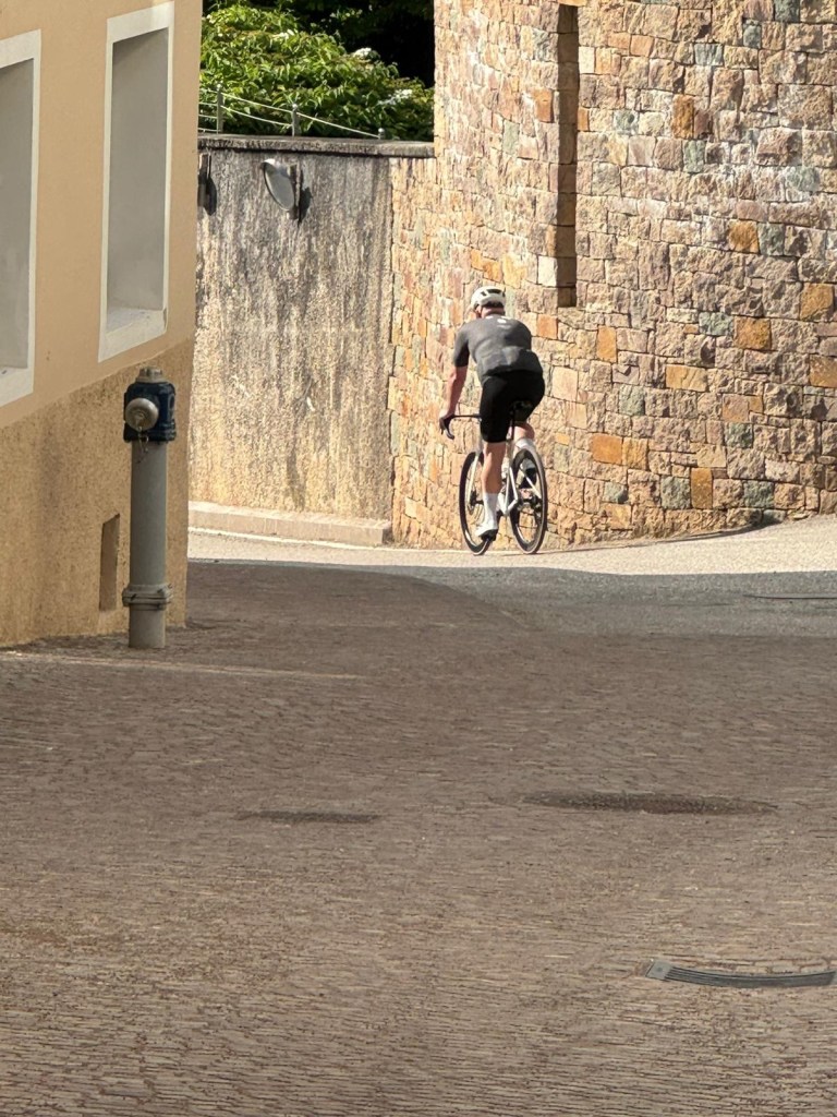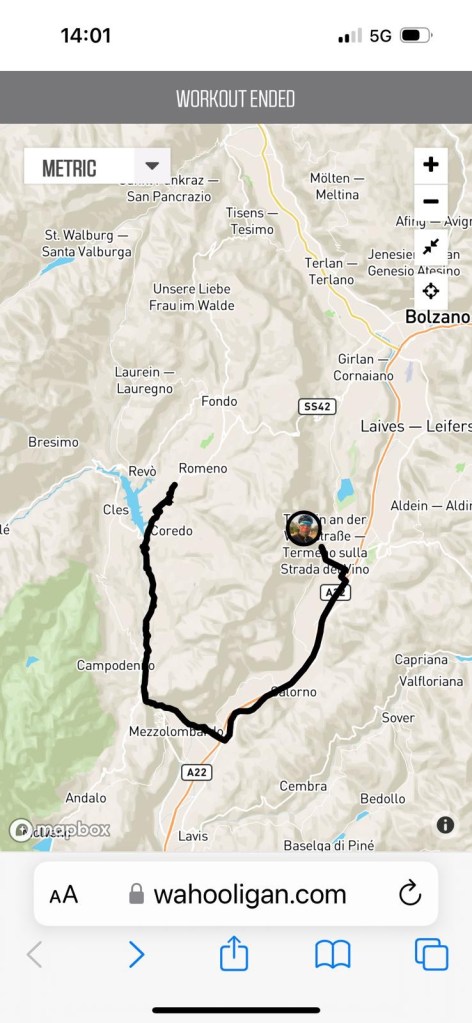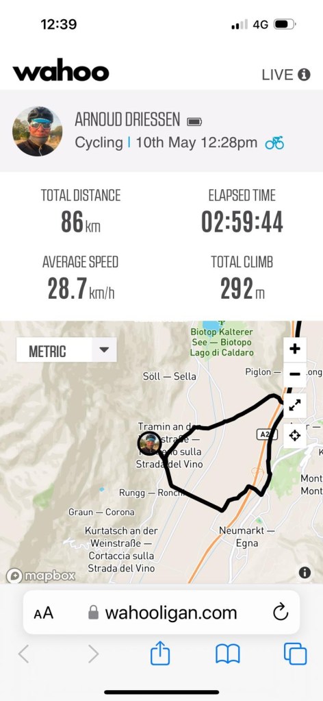 De uiterste uitdaging komt op de laatste kilometers. Terug omhoog naar Ansitz am Eck, ons verblijf in Tramin. De klim aangever van mijn Wahoo kleurt eerst geel en dan rood. Ik kleur ook rood. Zwalk de laatste meters naar boven. Moe. Er is een filmpje van. Had ik de camera vrouw maar moeten vertellen dat ik niet gefilmd wilde worden. Ik besluit haar niet te bedreigen om zo te voorkomen verder niet meer mee te mogen doen.