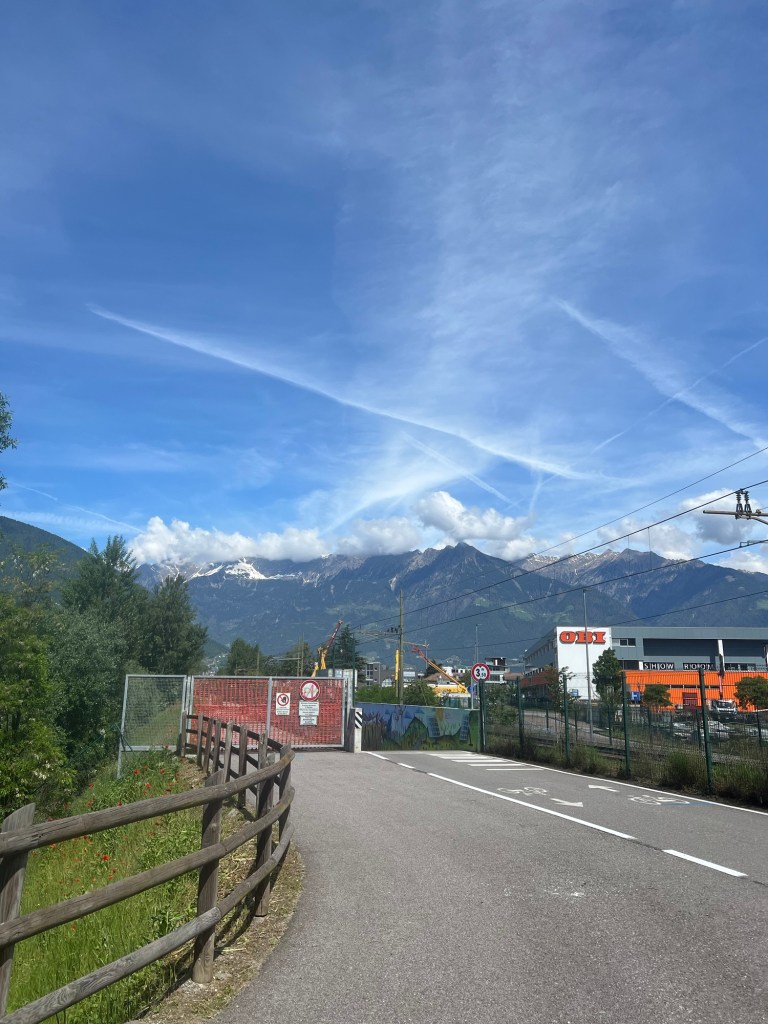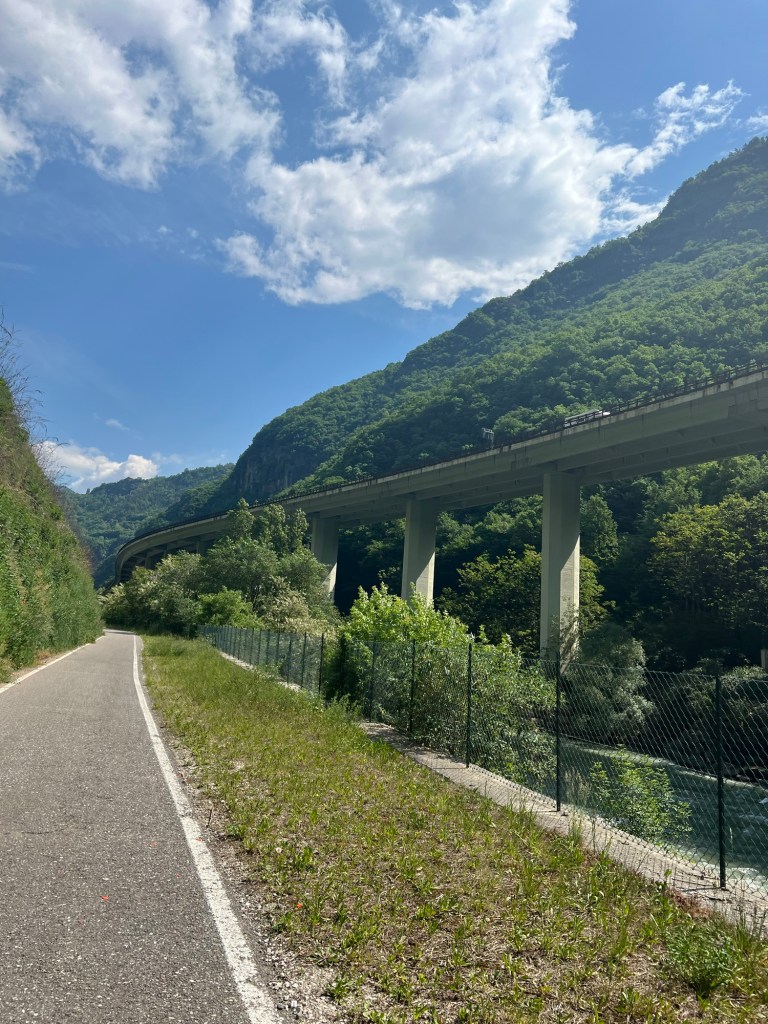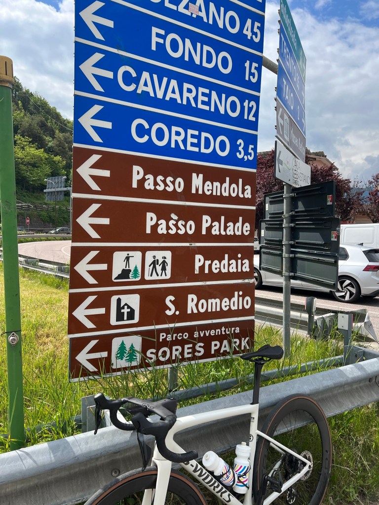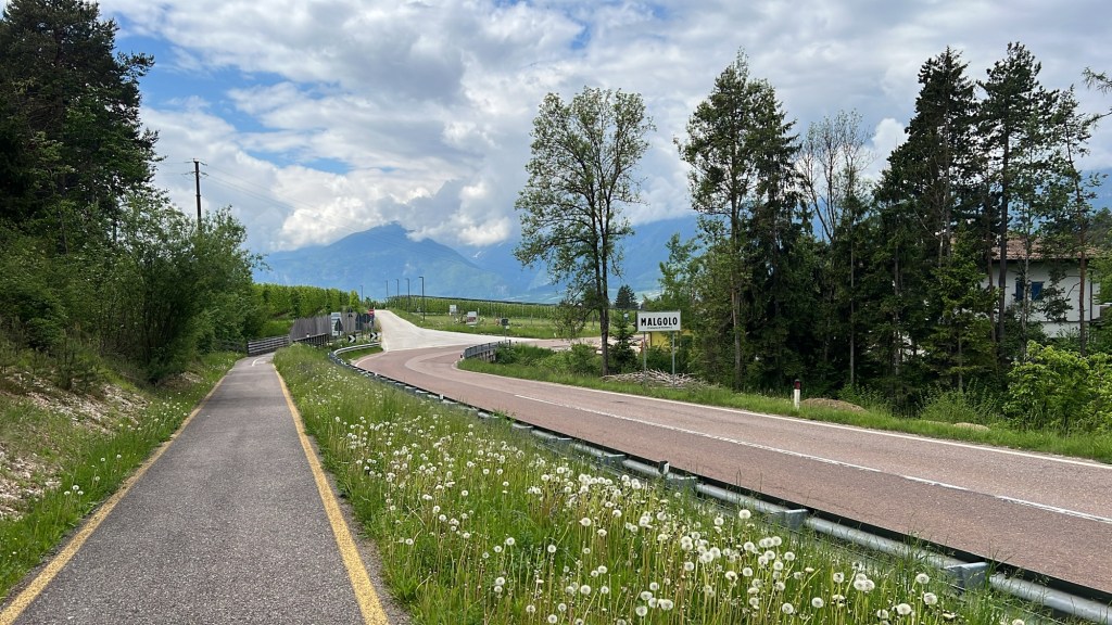Niets ingewikkelds. Fietspad op en trappen. Eerst in de richting van Bolzano en dan richting Merano. Lekker fietspad, dat heel veel bereden wordt door van alles en nog wat dat fietst. Van ik val nog net niet om tot ik ben een tijdrit aan het trainen op een tijdritfiets.