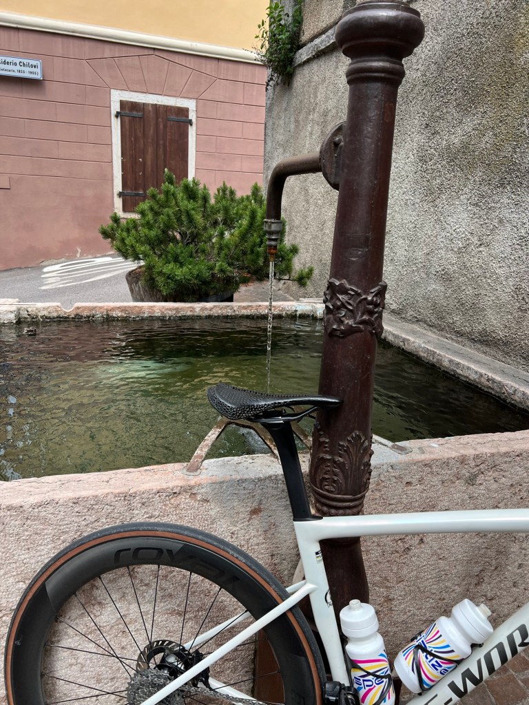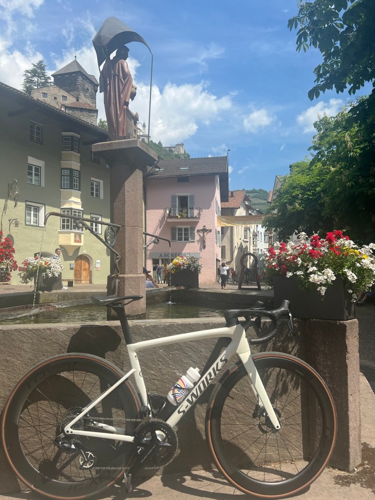 Zo ga ik op pad. Voel me goed op de eerste kilometers. Fluim en snuit wat in het rond en fiets voorbij Bolzano. Daar is een triathlon. Typisch Italiaans wordt het groots aangepakt. Sporters lopen zich warm voor het zwemmen, mooie triathlon fietsen zie ik en er hangt een helikopter in de lucht. Vast ergens op een obscure locale zender ook nog te volgen.