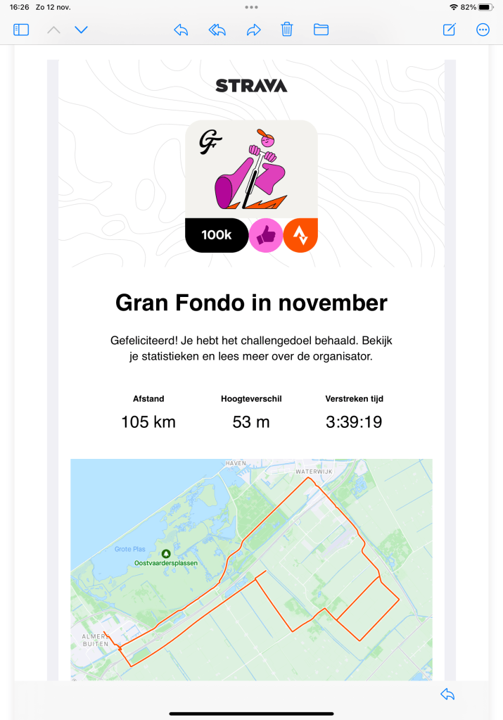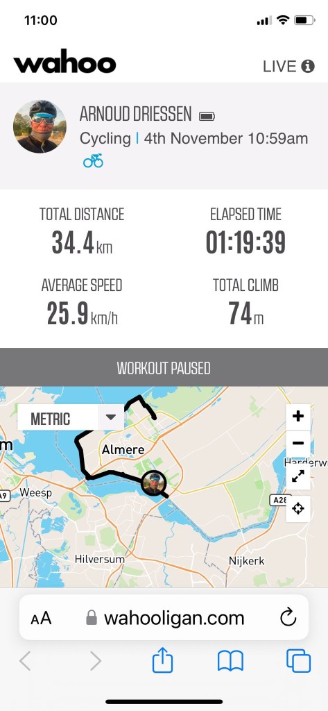 Dus met een klein zetje ging ik naar buiten. Als je eenmaal het uurtje binnen fietsen aanvaard hebt, dan is nu eenmaal een winter kit aantrekken ook weer een opgave. Maar ik ging naar buiten. Zonder moeilijk te doen had ik besloten. Naar het rondje in de polder. Paar blokjes om. Alleen voor de kilometers. Niet voor de schoonheid van de route. Die 11e lonkte namelijk nog. De november 100.