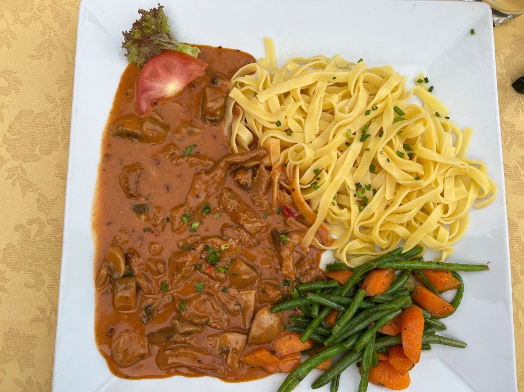 Gelukkig serveren ze bij Pernhof ‘s avonds een heerlijk gerecht van bandnudeln en geschnetzeltes. Dat vult de energievoorraden weer aan.