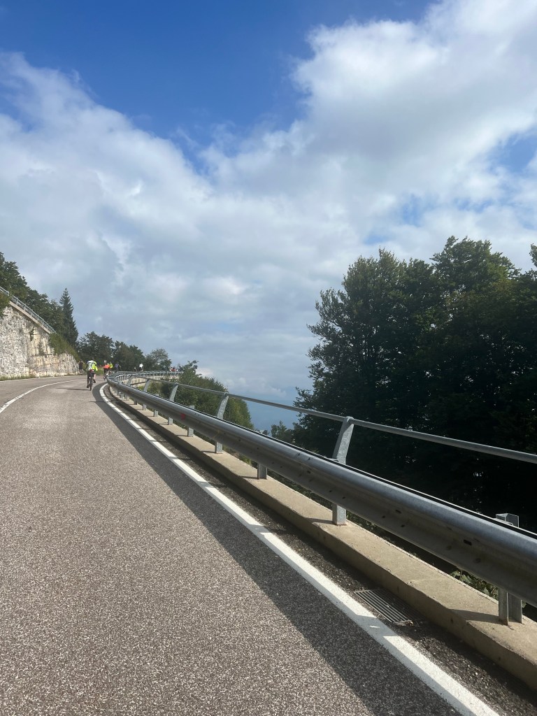 Ik klim en vind een ritme. Een goed ritme. Ik puf wat, ik zweet veel, drink als mijn Wahoo het me opdraagt en knijp ook een gelletje leeg als me dat bevolen wordt. Ondertussen haal ik de nodige mensen in. Er rijdt echt van alles en nog wat tussen. Bij de mensen die ik inhaal zitten er ook die ik wel als wielrenner zou kwalificeren. Ondertussen wordt ik ook geregeld ingehaald natuurlijk. Door de bekende elektrische MTBs op full Speed, de gespierde spijkers en “echte” wielrenners.