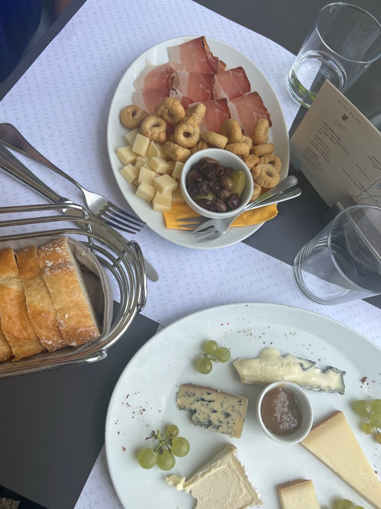 Met E heb ik afgesproken om bij de bakker in Tramin een broodje te eten. Die sluit helaas zijn deur om 12:00 en daarom belanden we bij Ellena Walch in de tuin. Ellena is de “Grand dame” van de Südtiroler en Italiaanse wijnen.
