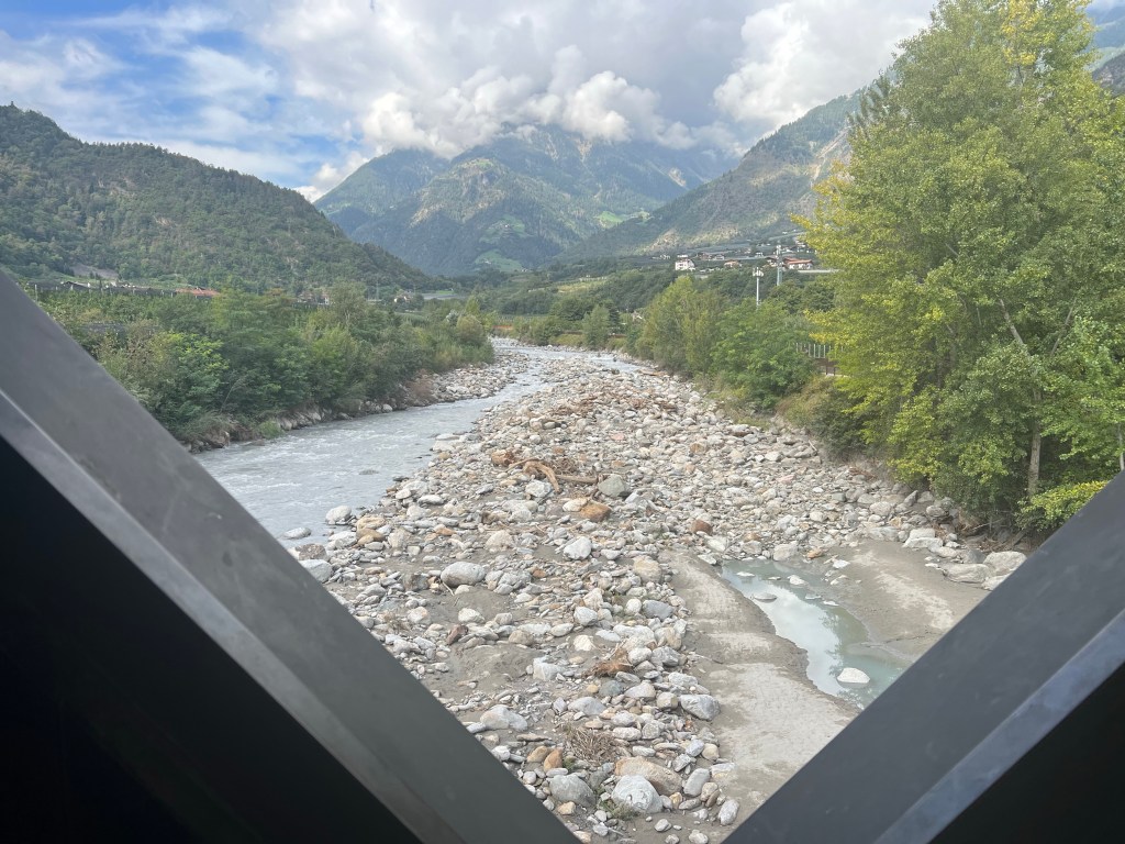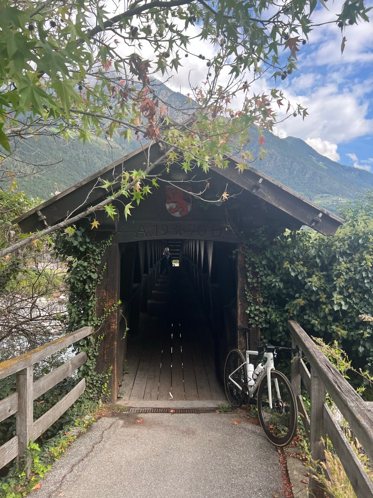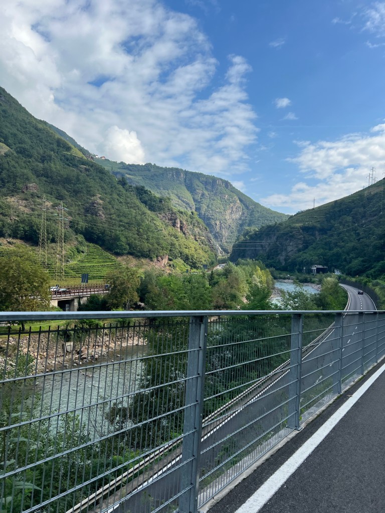 Eerst trappen over het fietspad naar Bolzano en dan meteen de reden waarom ik dit niet veel vaker doe. Je moet door Bolzano. Mooi fietspad door parken, maar helaas met een lastige wegopbreking in het midden van de stad. Dat haalt het plezier er wat uit, ook al maakt de route enorm veel goed er na. De A22 berijders kennen de weg die al mooi is in de auto langs de rotswanden, maar die vaak weggestopt worden in tunnels. Als fietser heb je het dan beter. De tunneltjes zijn van de oude spoorlijn en je krijgt mooi asfalt in een net zo’n mooie omgeving. Soms geslingerd door een dorpje, maar dan weer recht vooruit.