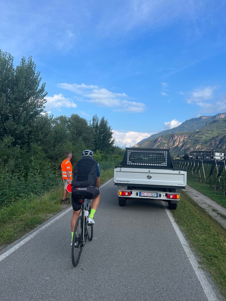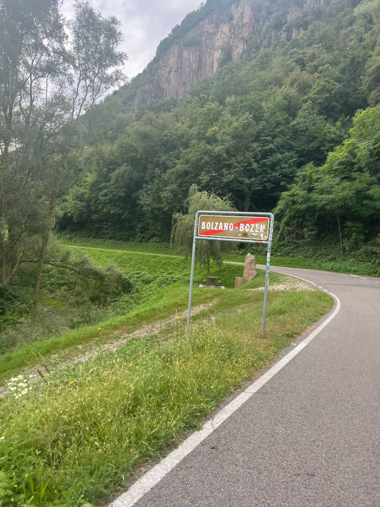 Na Bolzano is het nog een aantal kilometers tegen de wind in. Ik schakel niet bij, ook al snakken mijn benen er naar, maar blijf draaien. Soms is op beentempo blijven rijden vermoeiender voor de spieren lijkt het wel, ook al is het zeker niet belastender.
