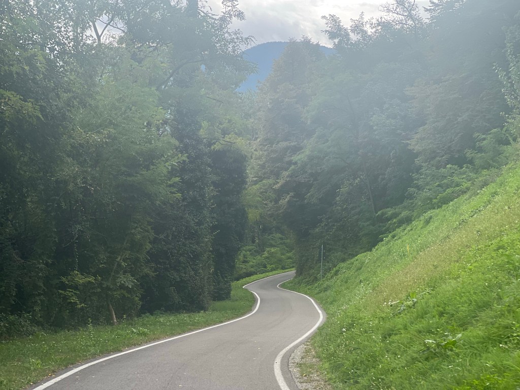 De hele weg loopt langzaam maar zeker om en laat de energie voorraad langzaam uit je lijf weglopen. Uitpersen. Zelfs als je, je niet het snot voor ogen rijdt. Het is vandaag wee benauwd en een zweterig weertje.
