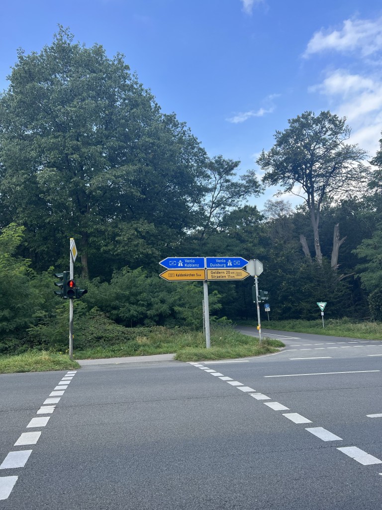 De ronde gaat niet alleen door Nederland. Odido, het vroegere T-Mobile stuurt me dat ik in Duitsland ben. De verslechterde fietspaden, de andere huizen en de gele borden geven meer duidelijkheid.