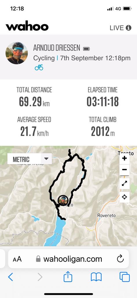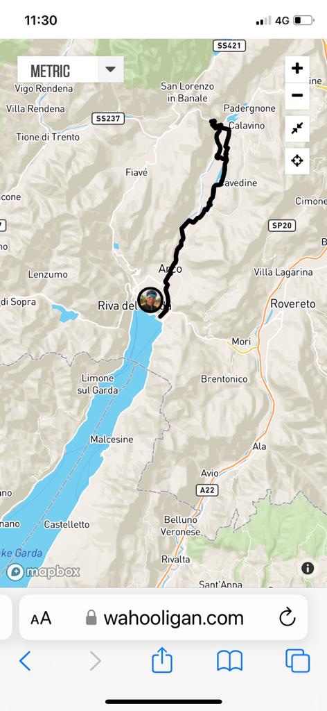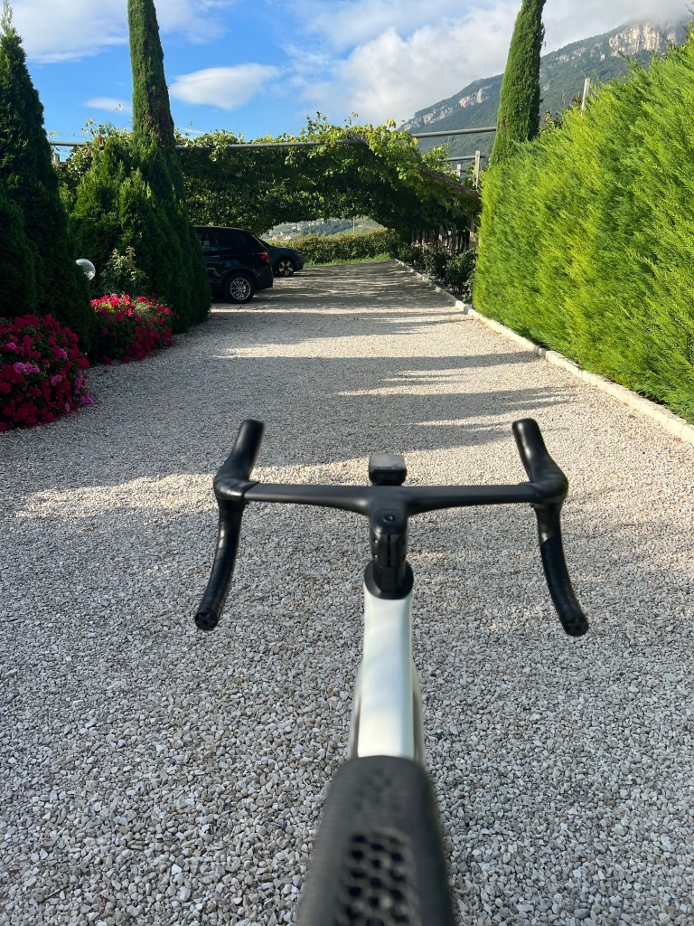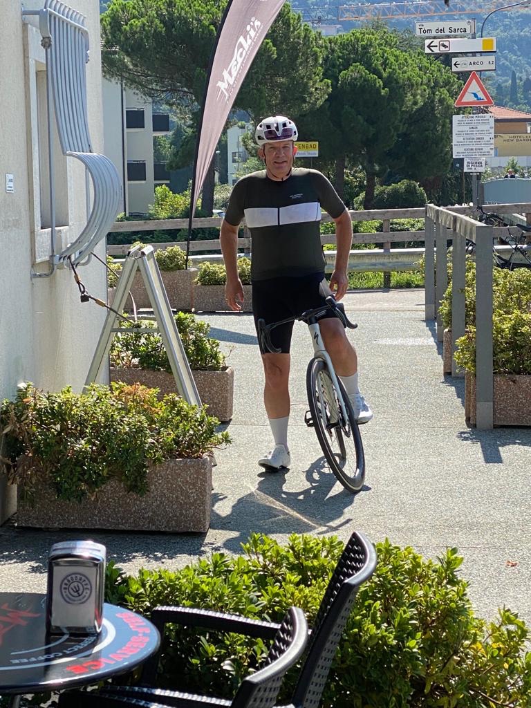 Naar Dro en dan door naar Arco. Ik rijd tempo over het fietspad en hoor dat er iemand in mijn wiel zit. Meer mij. Terrein dus ik fiets door en geef hand signalen bij sterk afremmen en als we andere fietspad gebruikers moeten omzeilen. Zo vliegen we door tot Arco.