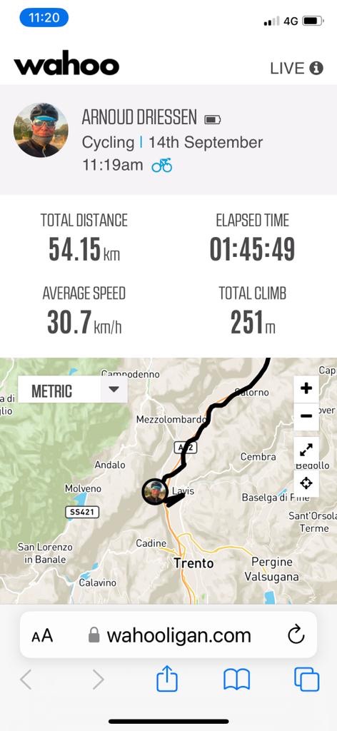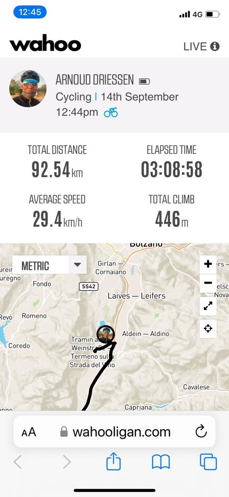 Ik rijd naar het fietspad en begin mijn eerste blok. 30 minuten rond 80% van ftp. Daarmee kun je een lekker tempo rijden en zo rijd ik tot Bolzano en een stukje richting Merano. De eerste 30 minuten zitten er op als ik net een geblokt rennertje voorbij rijd die in mijn wiel kruipt. Ik bega de fout om door te rijden. Doordat het hier lichtjes oploopt krijg ik net dat beetje meer weerstand en in plaats van te vertragen versnel ik iets. De wattages gaan wat omhoog. Het loopt als een trein. Ik voel me goed en goed op de fiets. de man aan mijn wiel is vast een bekende van velen want hij krijgt geregeld zijn naam toegeroepen.