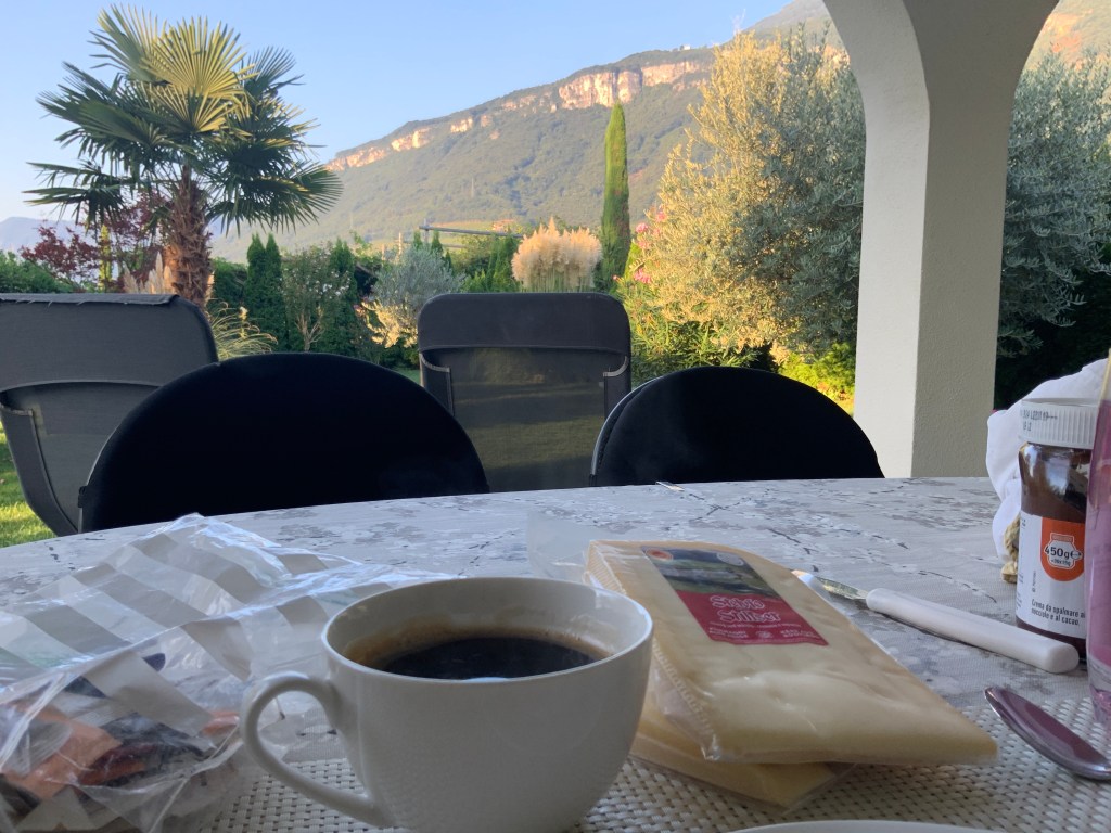 E is gaan lopen naar de markt in Arco en blijkt net een koffietje en een watertje aan het drinken te zijn. Ik schuif even aan. Veel meer vakantie wordt het niet voor mij.