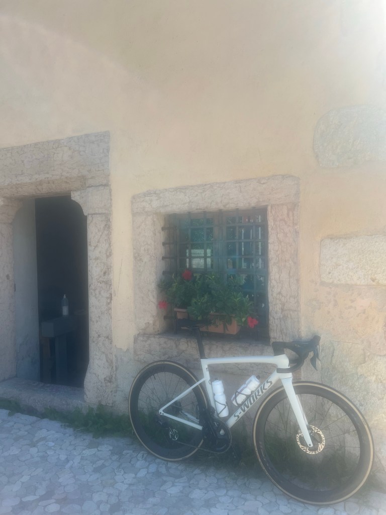 In het dorp aangekomen bedenk ik me dat ik tien de weg door het dorp was afgesloten ik daar een klein klimmetje op moest om via een lusje weer op de weg te komen. Waarom dat er niet aan toe voegen? Was altijd verschrikkelijk voor me. Ik denk dat ik nog op de Pinarello reed. Min. Flamboyante uitstap.