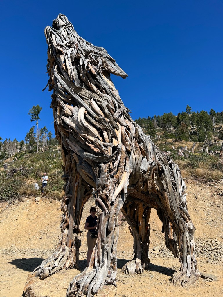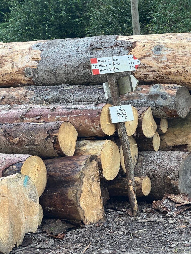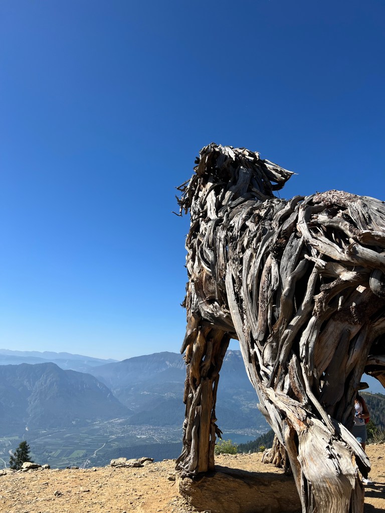 Als Lupo Wolfie dan niet mee gaat op reis, dan lopen we wel naar La Lupa del Lagorai gemaakt van de restanten van boven die omgevallen zijn door een over dit gebied woedende orkaan.