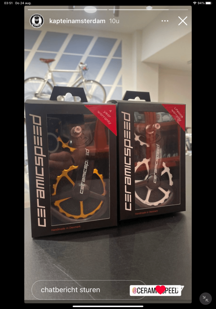 De rechter gaat mijn achterderailleur verfraaien en als Ceramicspeed adapt heb ik er vertrouwen in dat deze OSPW (OverSized Pully Wheels – groter dan de standaard versie zijn ze zeker) er ook voor gaan zorgen dat ik net een paar Watt minder nodig hebben om vooruit te komen.