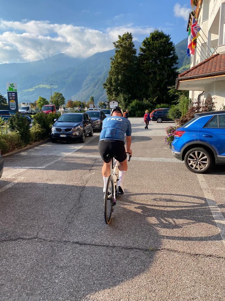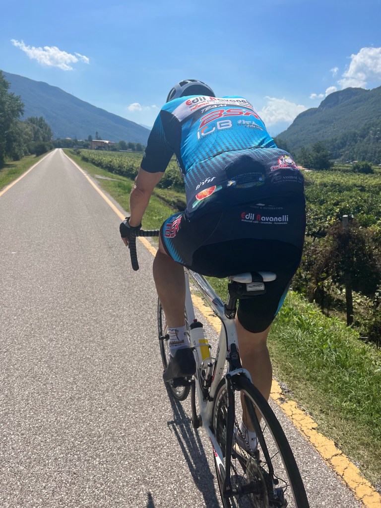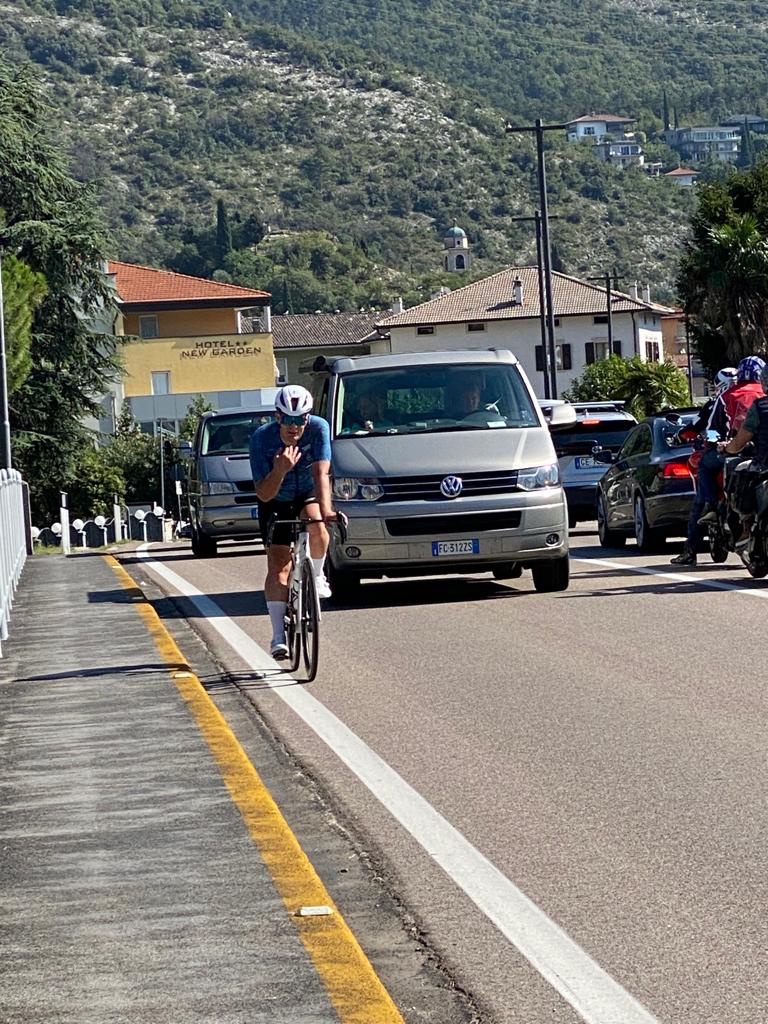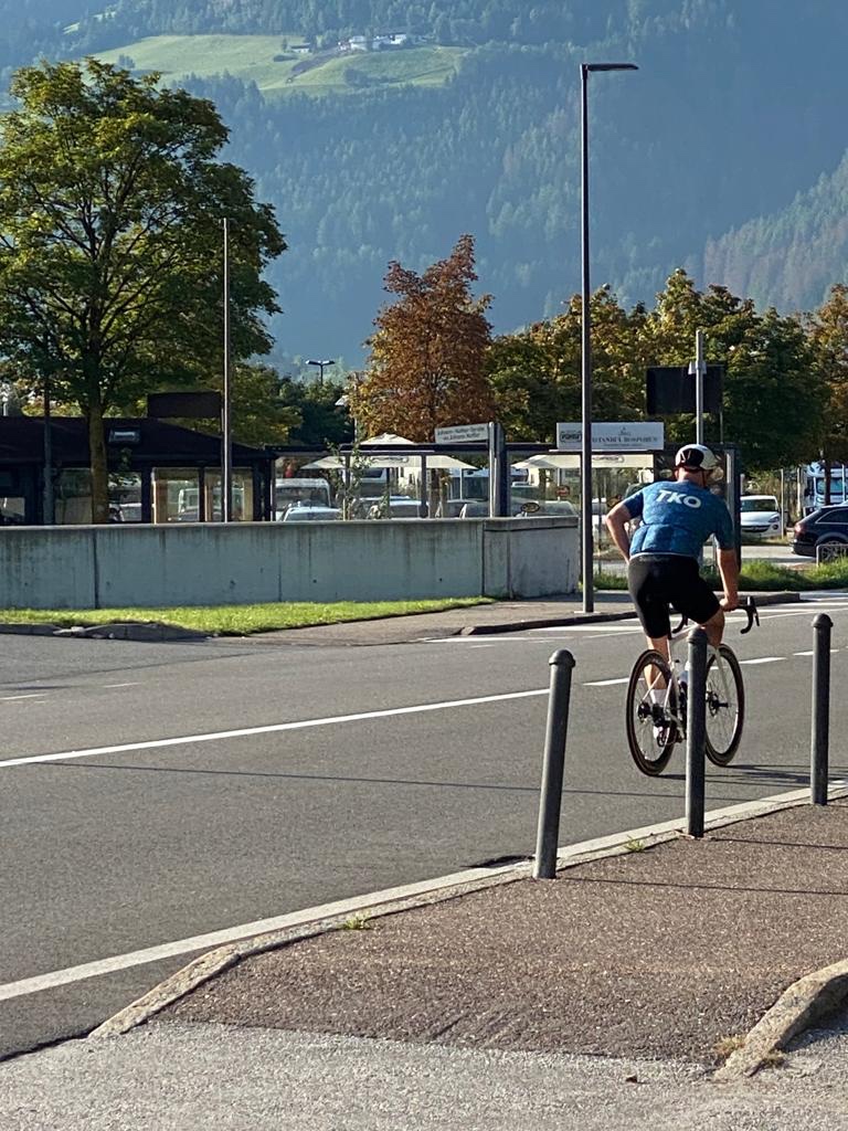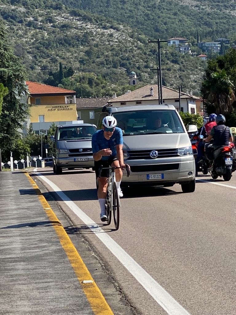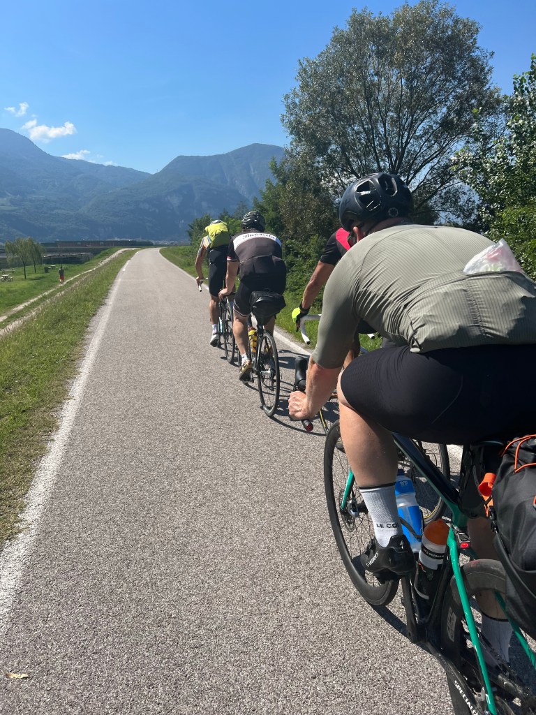 Zij rijden in twee dagen naar het Gardameer en zijn vandaag gestart in Brixen. Ik sluit aan en kan me een stukje verstoppen. Scheelt tegenwind, maar vraagt wel een iets hoger tempo.