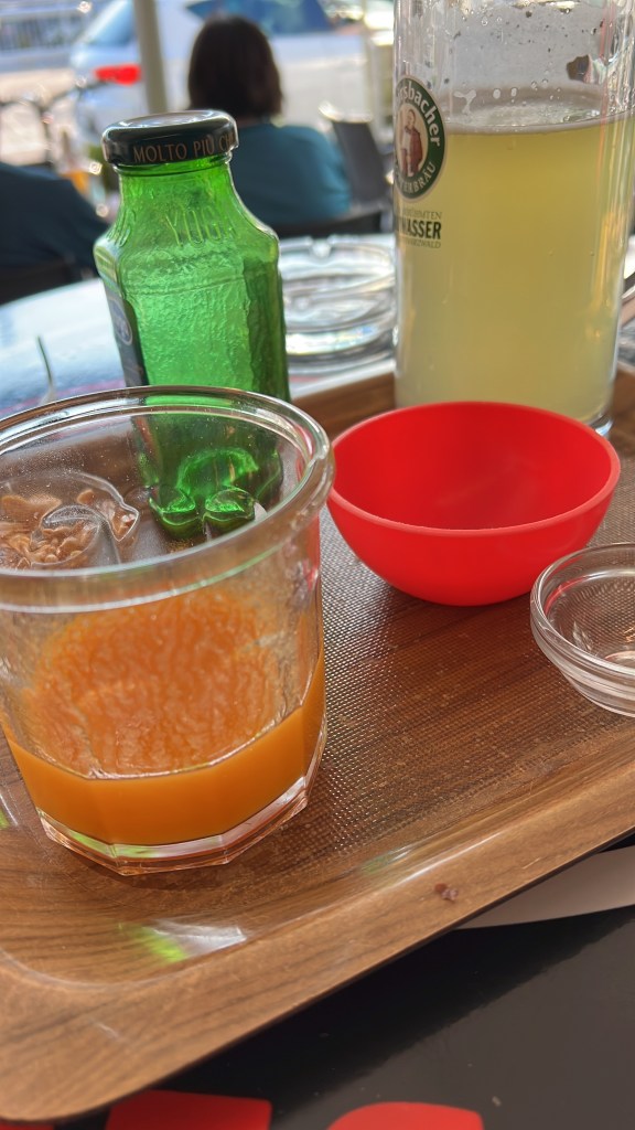 Bij Mecki’s aangekomen genoot ik van een koude Italiaanse sinas. Wat kan dat lekker zijn. Sanpellegrino. Niet. Alleen bij Vespa Laren een favoriet.