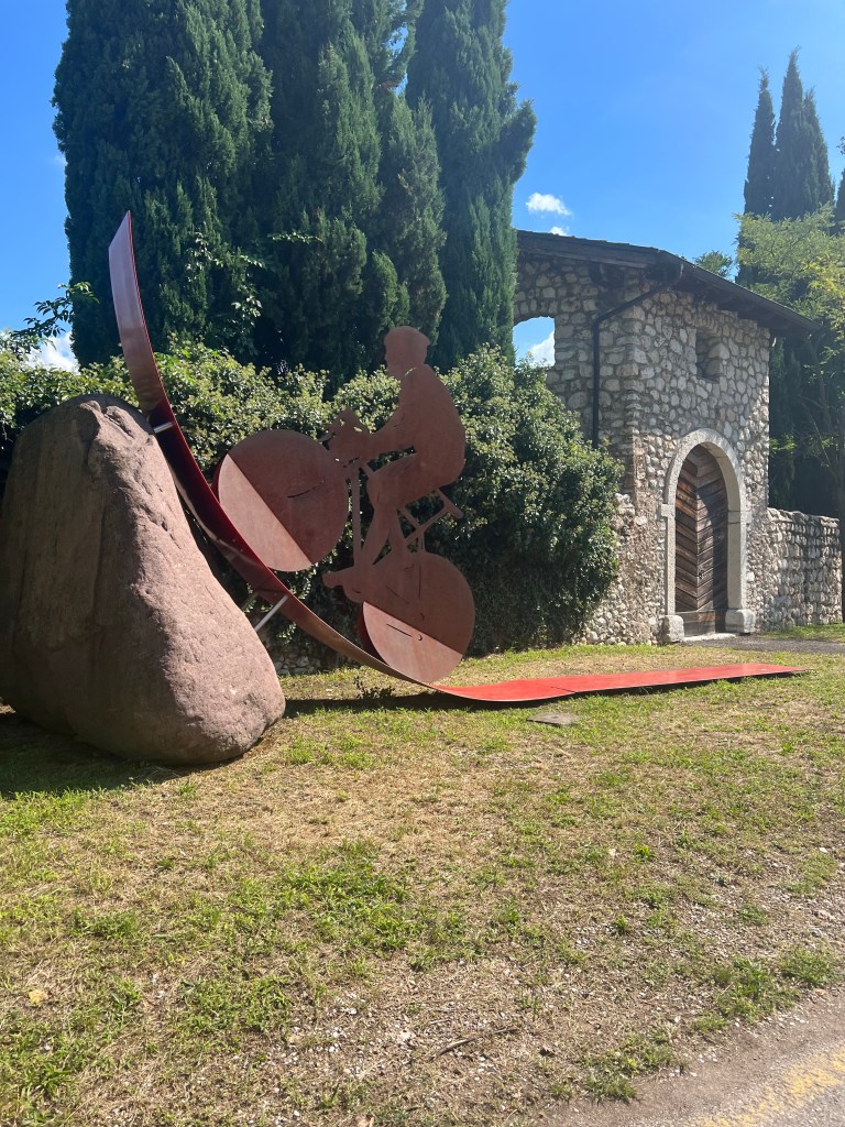 Rovereto en haar wielrenners beelden. Heel ver is het niet meer, maar het gaat nog wel heel zwaar worden. Eerst een stijle klim met een uitloper naar Mori. Het laatste deel van Mori naar Loppio, waar ik toch nog een bidon vul, loopt dan nog eens valsplat omhoog. Afsluiten doen we het dan nog een keer met een stijl rot ding het laatste pasje op.
