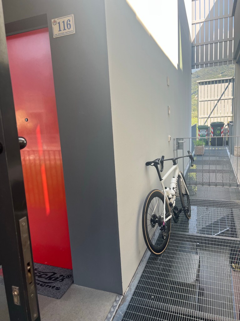 Voor dat ik ga rijden bekijken Rinaldo en Ivan mijn fiets. Allemaal mooi. Discussie over het stuur. Is het 40 cm. Ivan holt naar binnen om een meet lint te halen. Onder in de beugel is het dat niet. Daar is het 41 centimeter wordt gemeten. Bovenop is het 40. Het stuur heeft een klein beetje flair zoals dat heet. Zo is het stabieler als je onderin zit en heb je ook iets meer ruimte voor je armen. In gravel rijden ze soms met nog meer verschil en Pogacar heeft nu een stuur dat, dat ook extremer heeft.