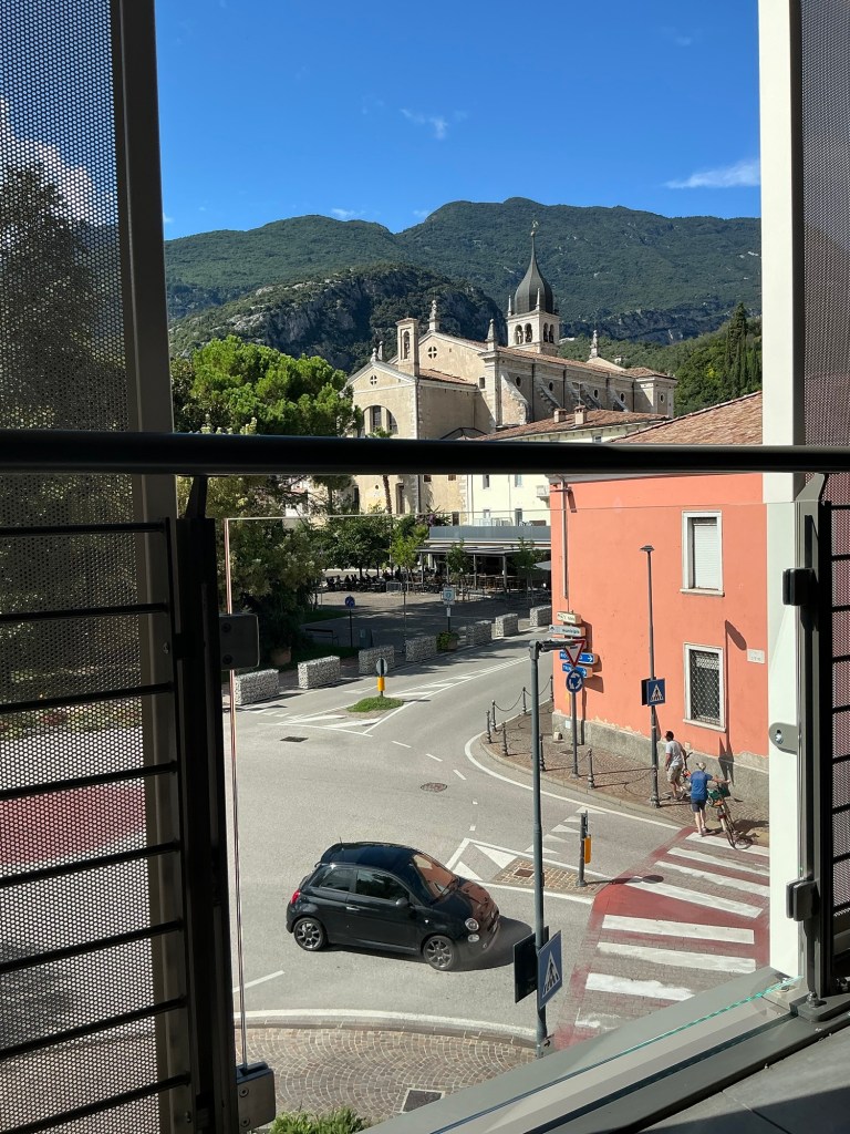 Daar deed het appartement zich alle eer aan. Beter dan dit wordt het volgens mij niet. Mooi ingericht, eigen garage en een balkon, laten we het terras noemen, rondom het hele appartement, waar de stappenteller enthousiast van wordt, met uitzicht op de kerk, het park en de burcht van Arco. Met een paar stappen ben je bij alles dat Arco leuk maakt en voor wie elektrisch rijdt zijn de laadpalen, snel, heel dichtbij.
