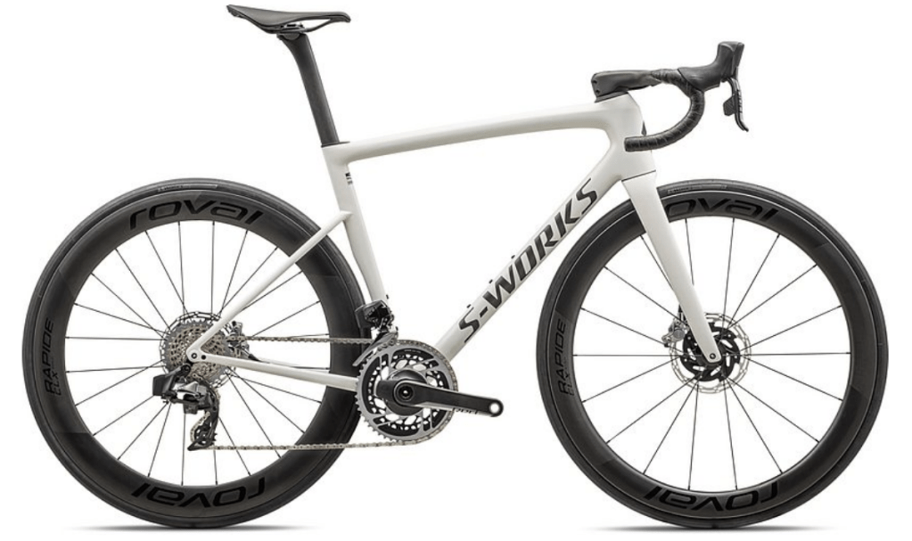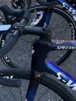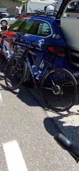 De S-works Tarmac Sl8. Dat Sl8 al gedeponeerd was door Specialized was eerder deze week opgedoken. Toen een zwartgemaakte foto van Evenepoel met een fiets en nu deze foto.