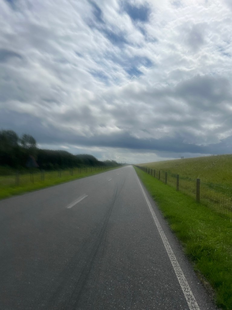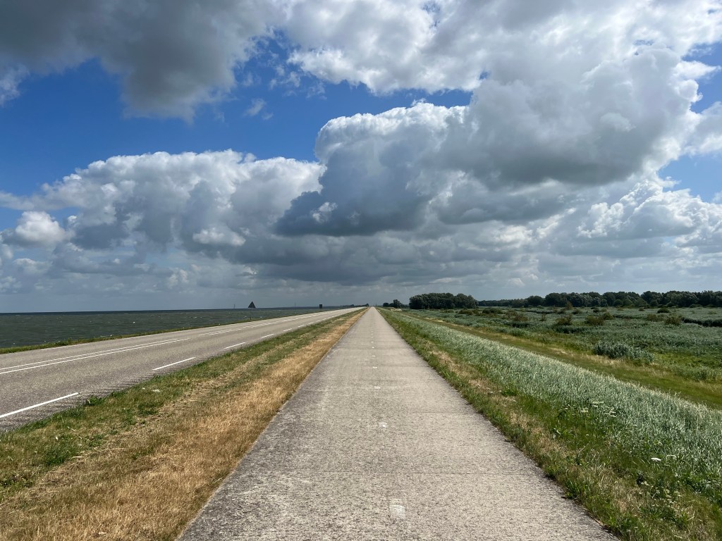 Ik raas door. Doe niet te gek. Het blijft rijden en niet werken. Ik zie wielrensters die worstelen tegen de wind in. Ik vermoed met tranen biggelend over hun wangen. Het is geen feest zo over zo’n ellenlange dijk te moeten ploeteren.
