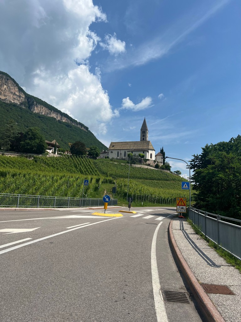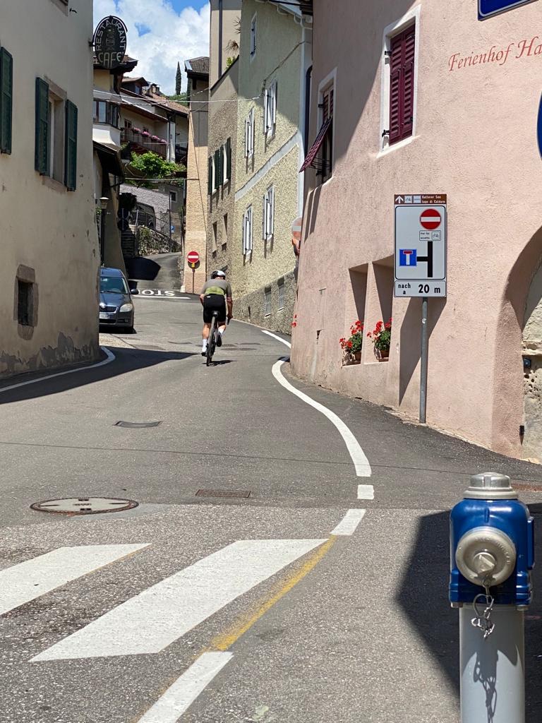 Helemaal vervelend wordt het klimmen in het plaatsje voor Tramin, de keer moest blijkbaar hoog over het dal heenkijken. Daarna mag ik gelukkig weer een stukje naar beneden om helemaal door het dorp in te klimmen op zoek naar de koffiestop.