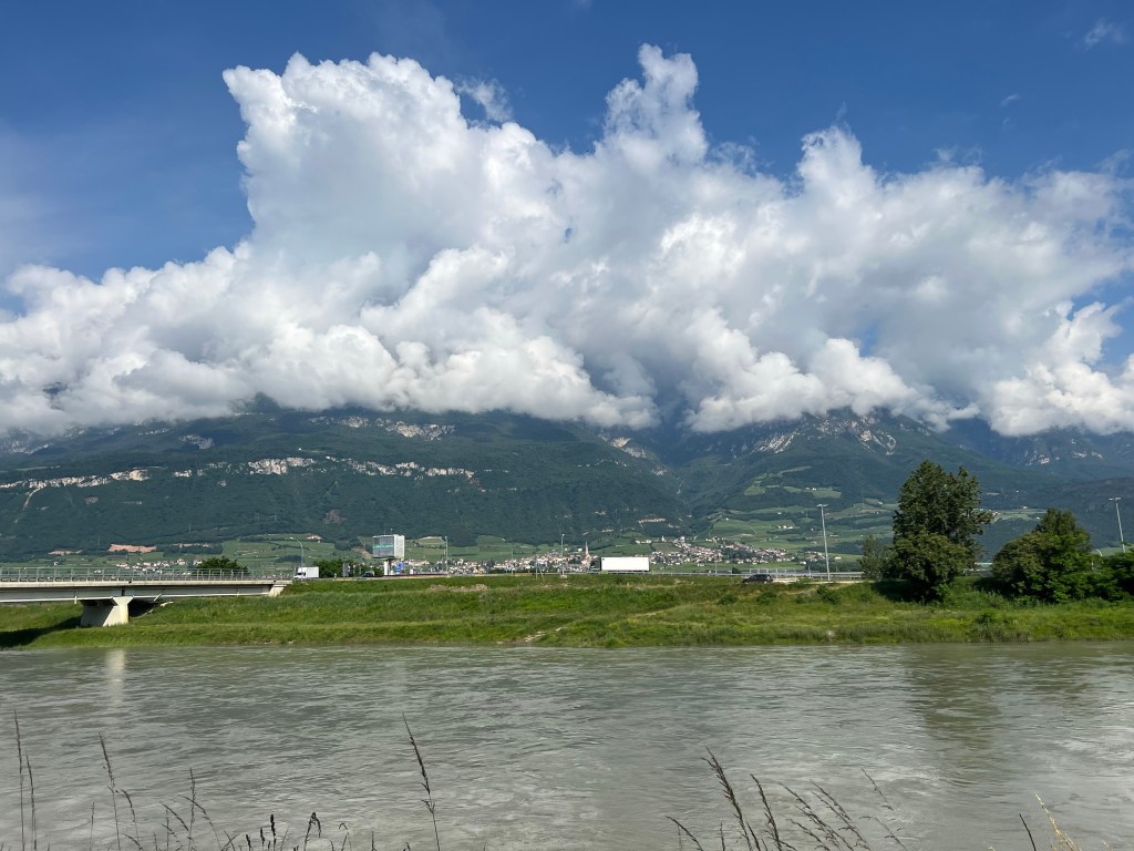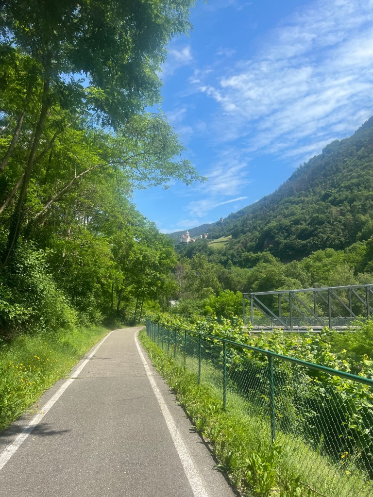 Ik moet midden door Bolzano langs de Piazza Walther door een fietspadopbreking. Ik ben blij dat ik de weg ken door de vele bezoekjes die we eerder brachten. Door naar het fietspad. Na het verlaten van de stad wordt het als snel mooier. Langzaam stijgend door het dal. Slingerend langs en onder de A22 door.