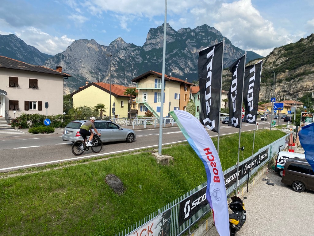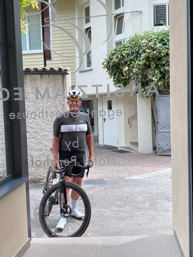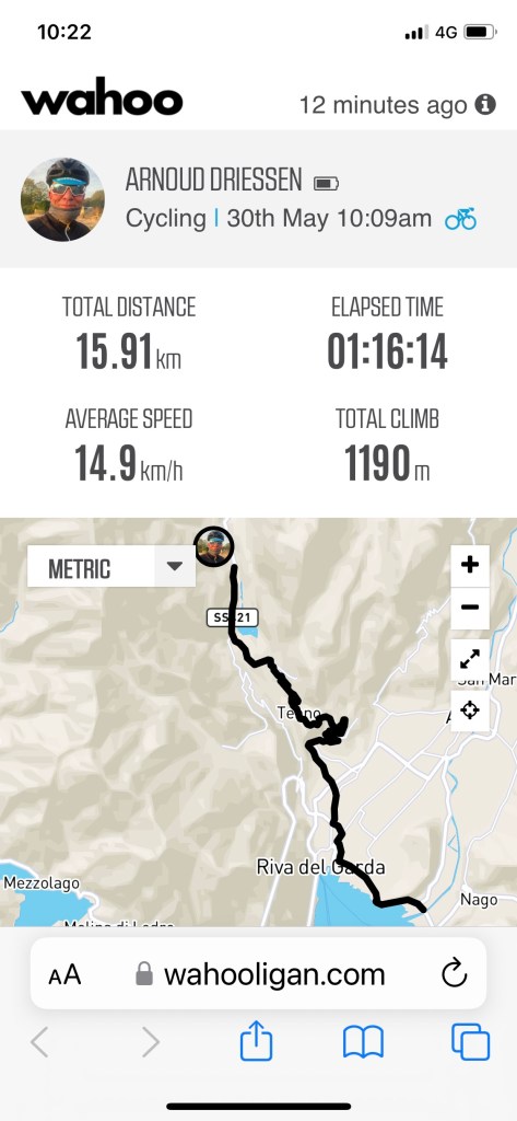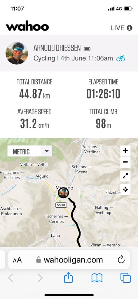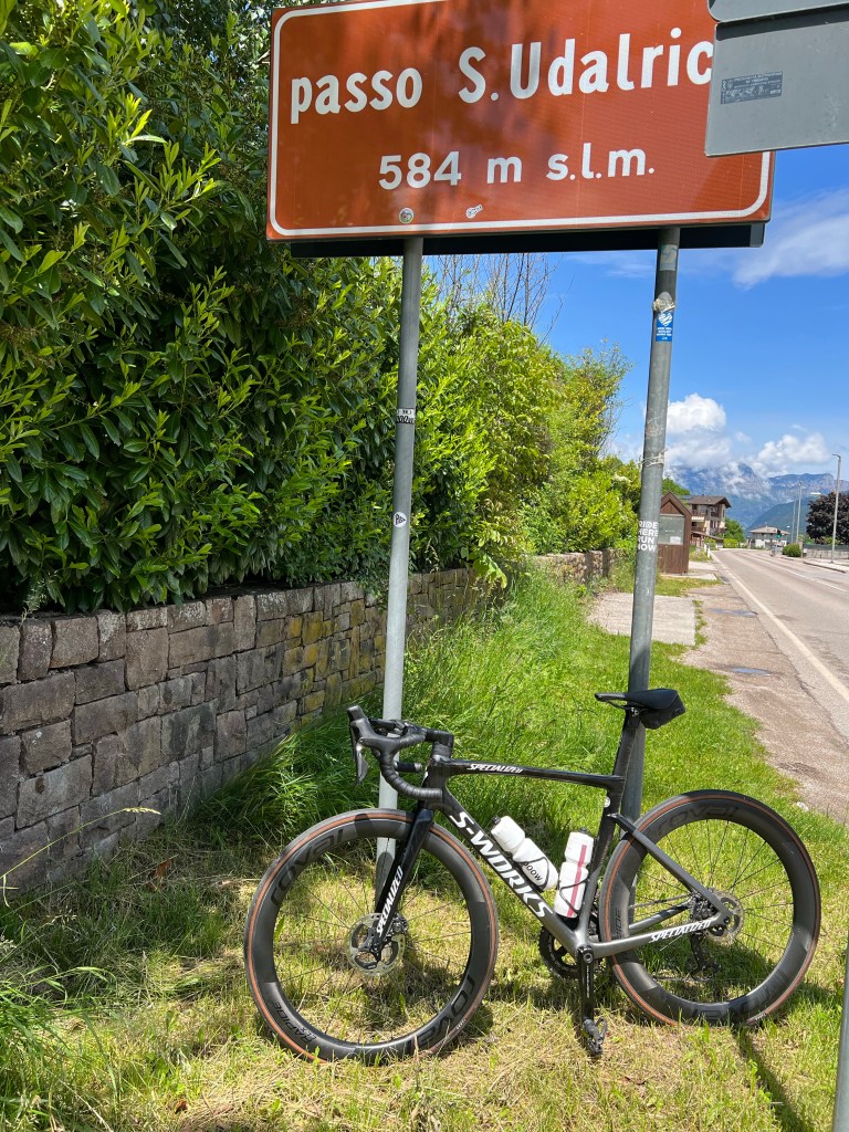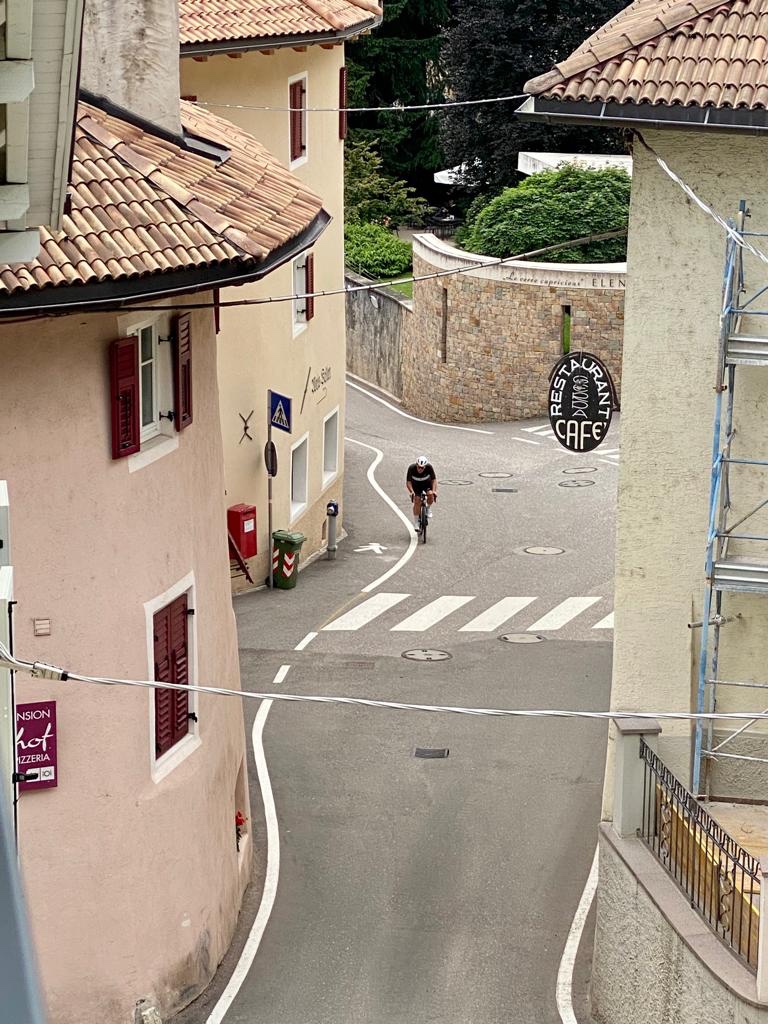 Bij Bolzano in de buurt de afslag nemen naar Meran. Bij het water punt stak een wielrenner net zijn bidons in zijn houders. Zoals later bleek om daarna in mijn wiel te duiken. Ik zag in de verte een mooi richtpunt rijden. Focus daarop en strak tempo. Langzaam maar zeker haalde ik hem binnen. Dacht een wiel te hebben, maar Italiaans slinks liet hij me er voorbij. Door dan maar.