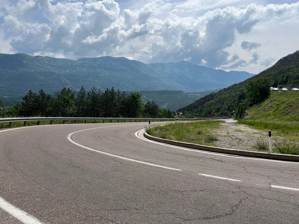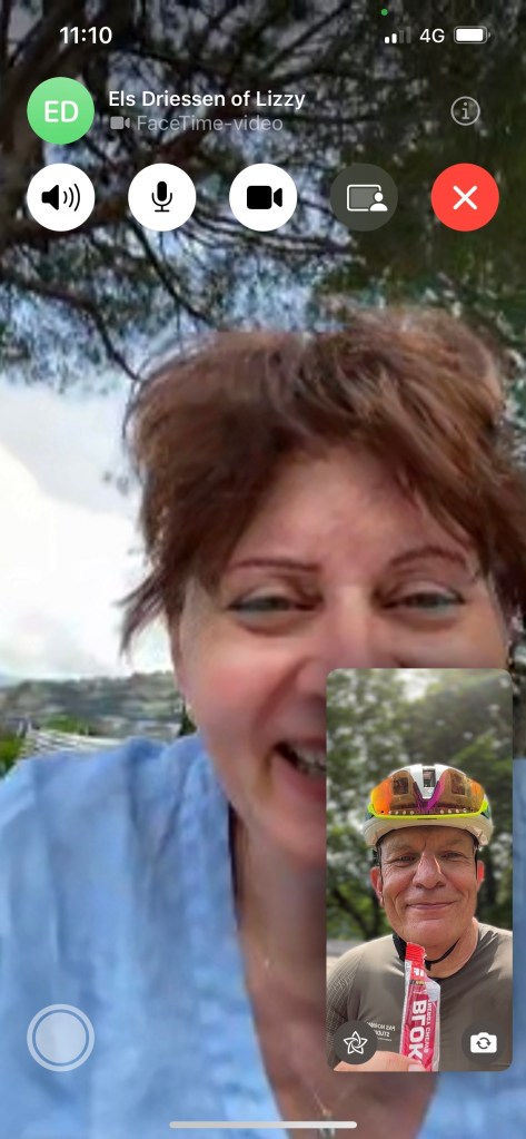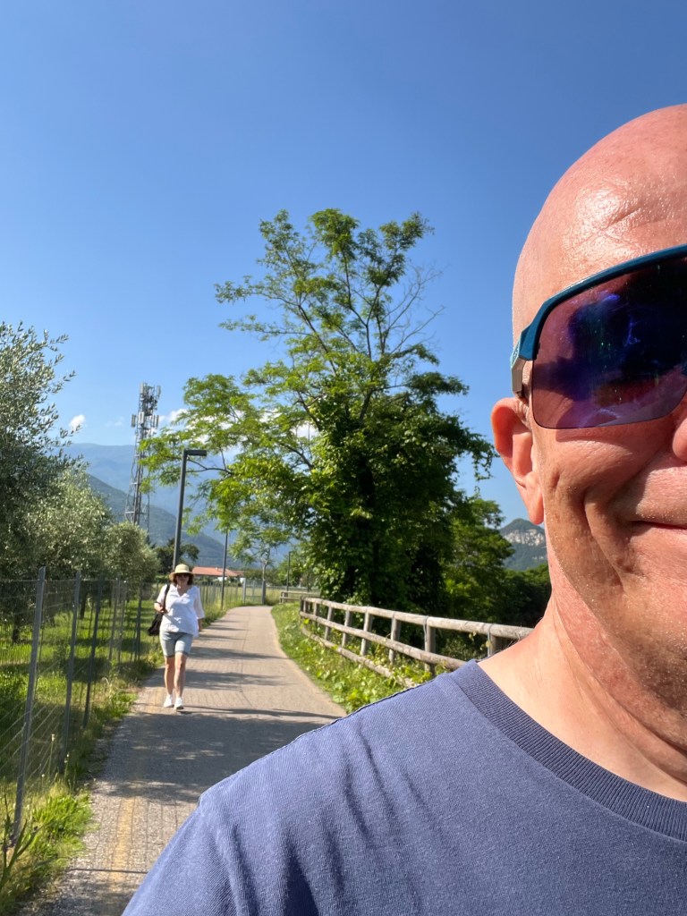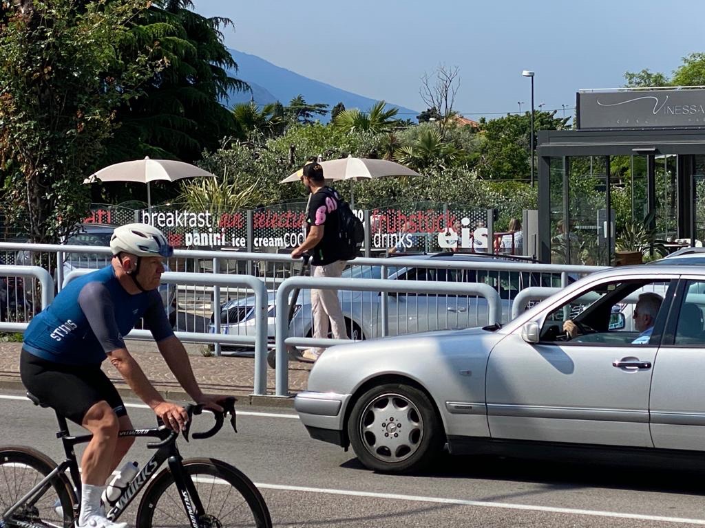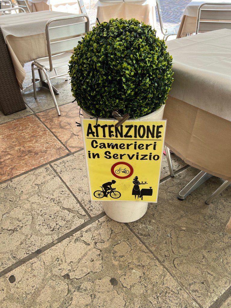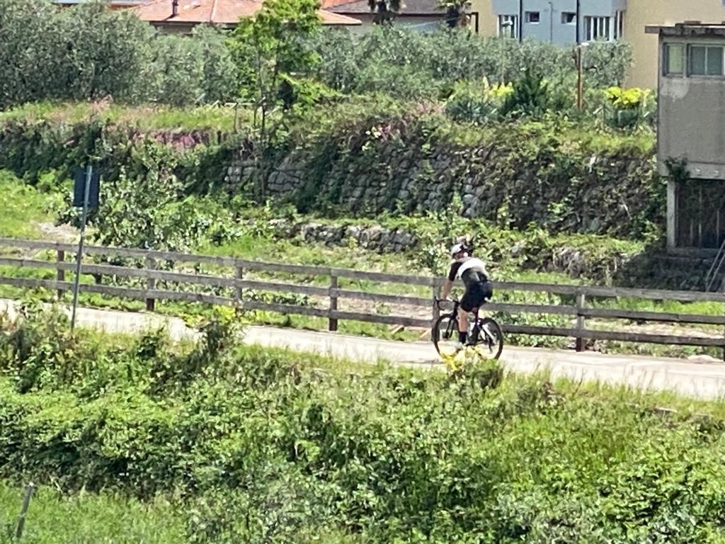 De afstand bleef gelijk, maar het leek op een gegeven moment kleiner te worden. En kleiner. En kleiner. En kleiner. En zo dacht ik een wiel gevonden te hebben, maar bij weer een weg onderdoorgang, precies op het punt dat ik aansloot, rolde ik er sneller voorbij en werd me handig de koppositie opgedrongen. Dan maar weer gaan. Strak. Niet zeuren. Wie op kop rijdt heeft het meeste trainingseffect. Zo gingen we door. Nog een wielrenner die zijn excuses aanbood met een handje, omdat hij niet goed genoeg aan de kant ging toen ik belde. Italiaanse flair.