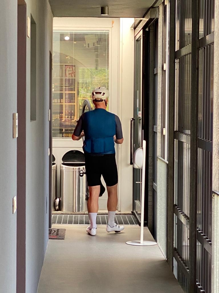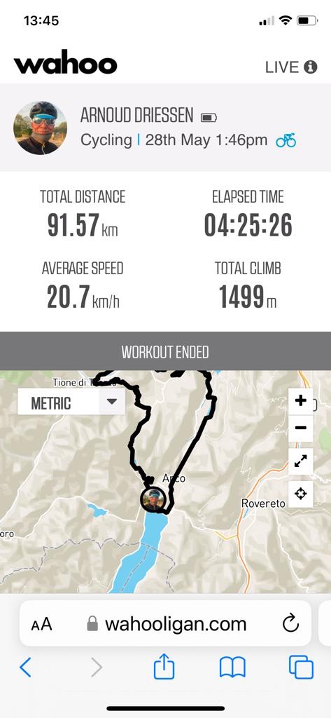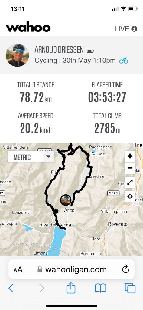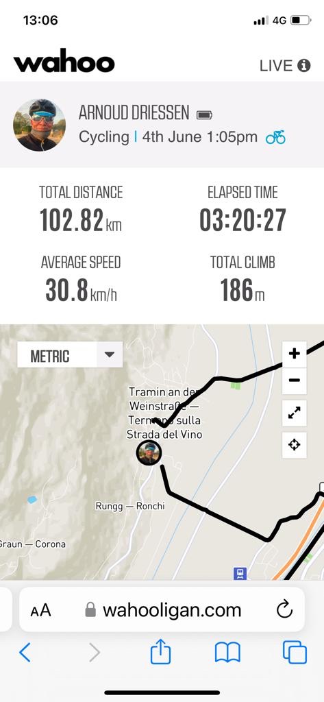 Ik liet het tempo wat vieren en besloot vandaag de 100 maar eens vol te maken. Dus waar Tramin rechts van me lag, reed ik nog een paar kilometer verder. Een Boogerdje XL. Omkeren deed ik op de plek dat de eerste druppels begonnen te vallen. Snel daar weg. De bui voorblijven. Dat lukte wonderwel en zo kwam ik moe maar wel heel erg voldaan weer in Tramin aan. Zelfs terwijl de laatste paar meters omhoog naar het appartement een kwelling zijn.