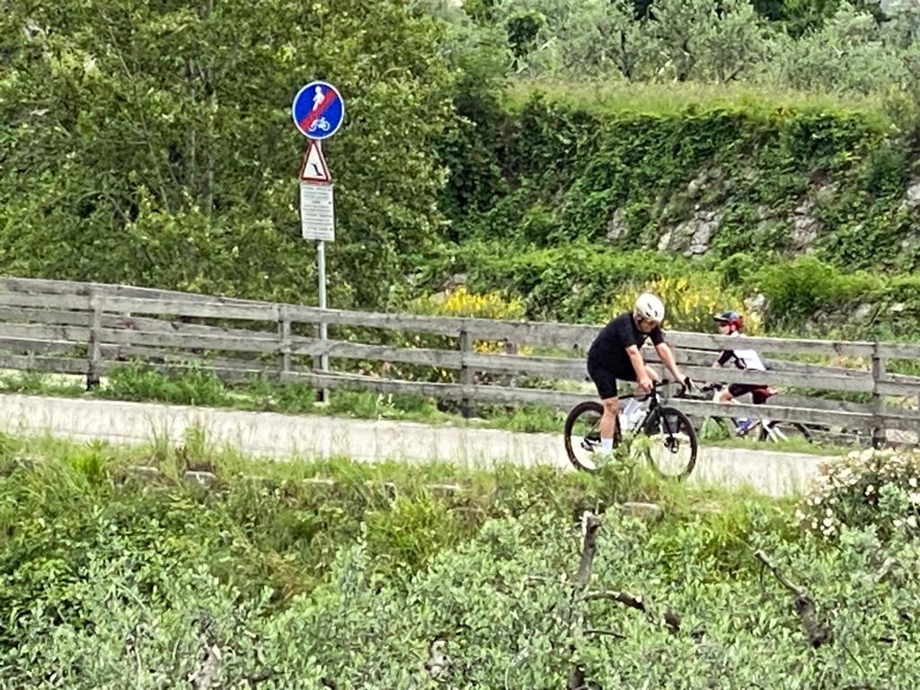 Het duurde lang maar er werd nog eens overgenomen. Het eerder richtpunt bleef zicht verstoppen. De andere hield het een minuut vol en bij een weg onderdoorgang, ging ik vlotter de laatste meters naar boven en zat zo weer op kop. Een vertrokken gezicht bij de ander en wat gekreun. Maar we kwamen al steeds dichter bij Meran. Tijd om te keren voor mij. Daar was ik ze kwijt. Kon wel nog twee oudere Nederlanders uitleggen waar het fietspad liep. Zij waren op weg naar Rome vanuit Nederland op hun elektrische fietsen. Ze dachten dat ik in de buurt woonde.