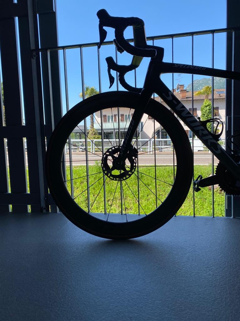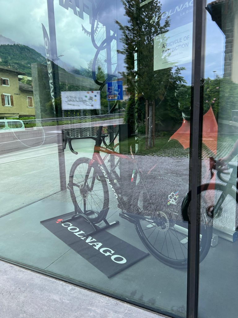De weg terug. Even stoppen bij Flarer. Een bekende fietsenwinkel hier, waar ook veel mensen Italiaanse fietsen bestellen in verband met de scherpe prijzen. Willier, Pinarello en Colnago in opvallende verschijningen. Helaas spiegelde het glas nogal, maar zelfs de C68 met gouden accenten hing in de etalage.