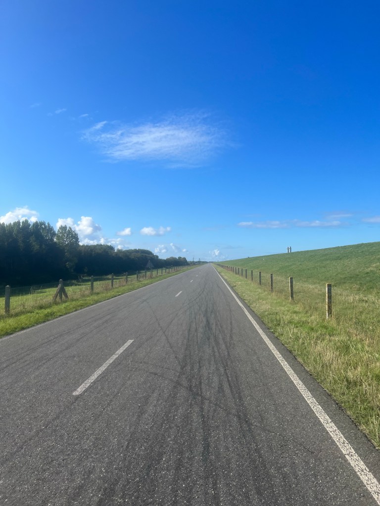 Na Lelystad zag ik op de dijk een groepje voor me. Zou lekker zijn om er bij mee te kunnen rijden. Wat gezelschap. Wat uit de wind. Maar toe ik er bij kwam en na een paar honderd meter uit hoffelijkheid de kop nam, om te laten zien dat ik van goede wil was, bleek dat ze bij mij niet meer over wilden nemen. Bleek dat er niets over te nemen viel bij de parkeer havens, omdat ze helemaal niet in mijn wiel zaten.