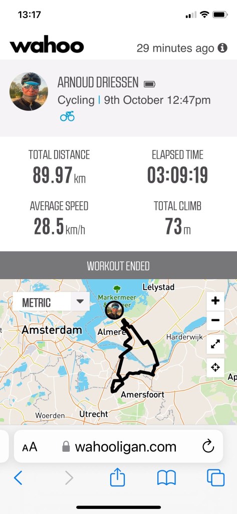 Een goed gevoel. Daar ontbreekt het een beetje aan. Dat beetje motivatie. Toch last van “oktoberitis”? Misschien wel. Beetje besluiteloos daarbij. Maar nadat de autoband bijgepompt was, sinds we het signaleringssysteem hebben nog nooit zo vaak noodzakelijk bijgepompt, gevoeld dat het toch echt beter was om te gaan rijden. Zelfs terwijl Join me een rustdag gunde. De buitenlucht zou me vast en zeker goed doen en voorkomen dat ik de hele dag wat voor me uit zou staren. Er zijn natuurlijk ook maar zoveel hemden en broeken te strijken en koerskilometers te kijken.